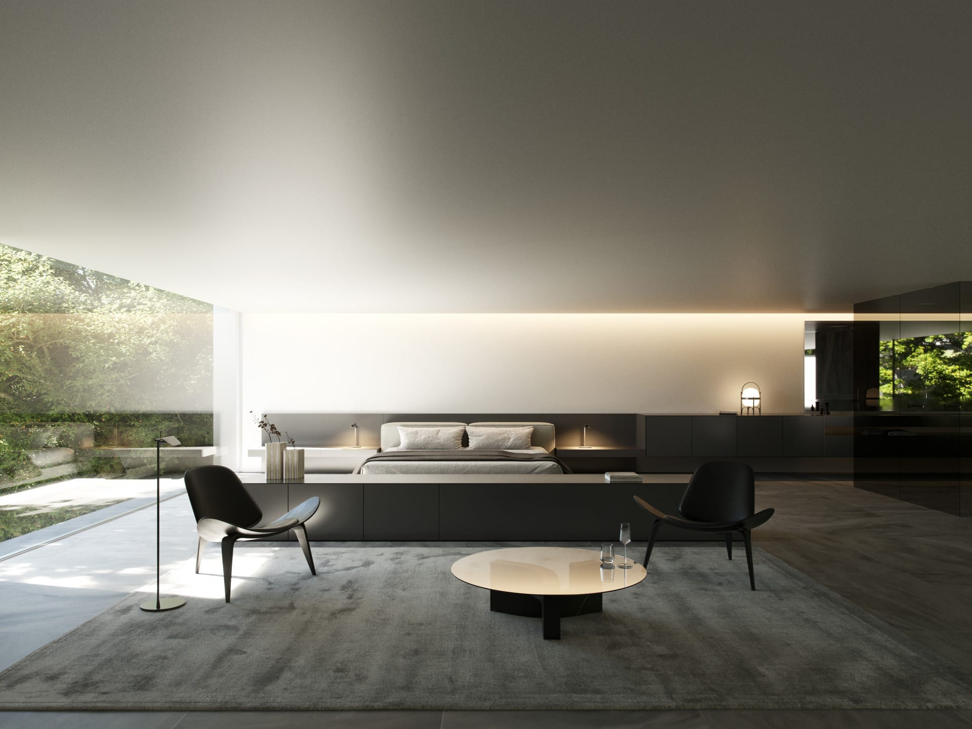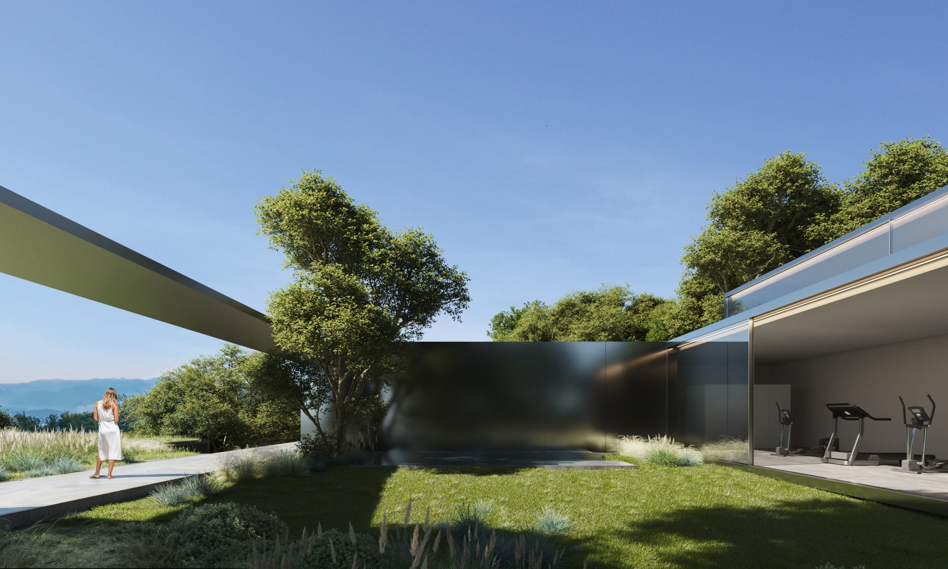 With a surface area distributed in a single volume that descends through the 4,047 m2 plot, all rooms offer complete and open views of the garden, as well as direct lighting and ventilation. In addition, each one has a private en-suite bathroom. The house has an outdoor pool measuring 8.9 m long and 2.1 m wide, located on the lower level above the guest house, whose shape follows the structure, facilitating its use for both sports and recreation, with a total area of 46.62 m2.