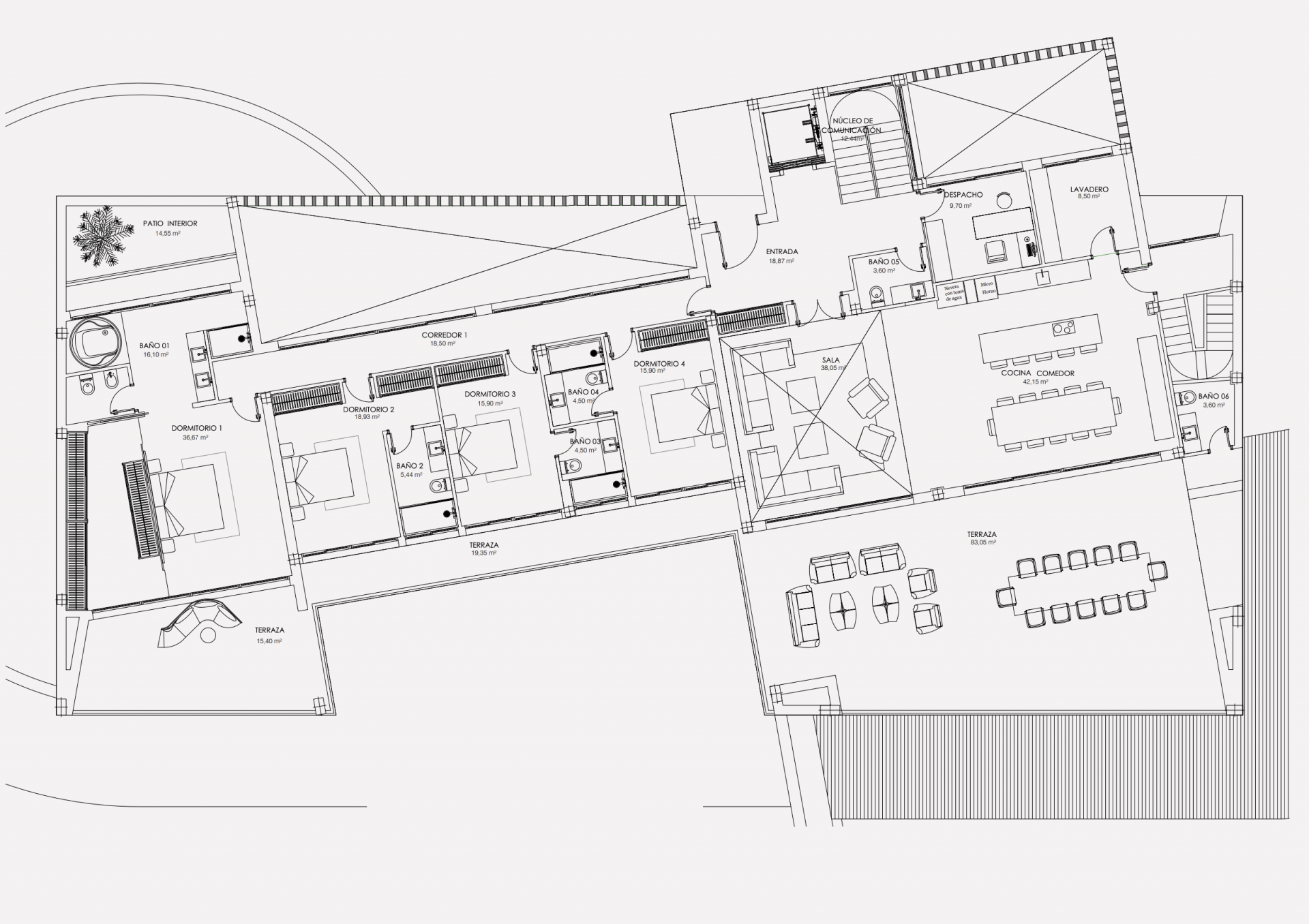 With a built area of 900 square meters on a plot of 2,872 square meters, this three-story villa is an exceptional example of design and comfort. The main floor houses four bedrooms with en-suite bathrooms, including the spectacular 110-square-meter Master Bedroom. The living room, with a spacious design and double-height ceiling, seamlessly integrates with the terrace and landscape. The spacious kitchen-dining room offers direct access to the terrace and the incredible L-shaped pool.