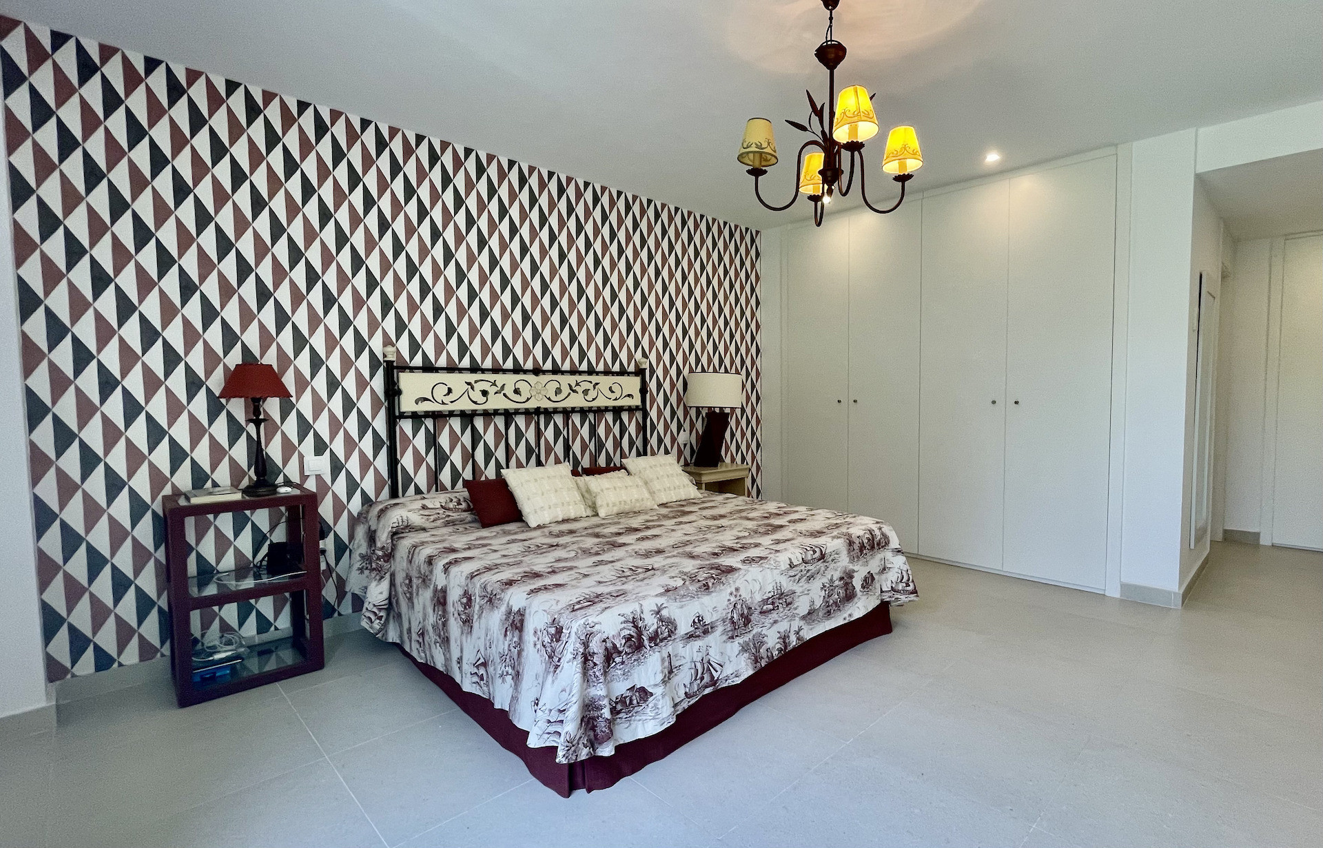 The sleeping area offers three spacious double bedrooms, all en suite, as well as a guest powder room. The property includes two underground parking spaces, providing security and convenience. Notable features include aerothermal climate control, double-glazed windows, porcelain flooring, built-in wardrobes, and mosquito screens in every room.