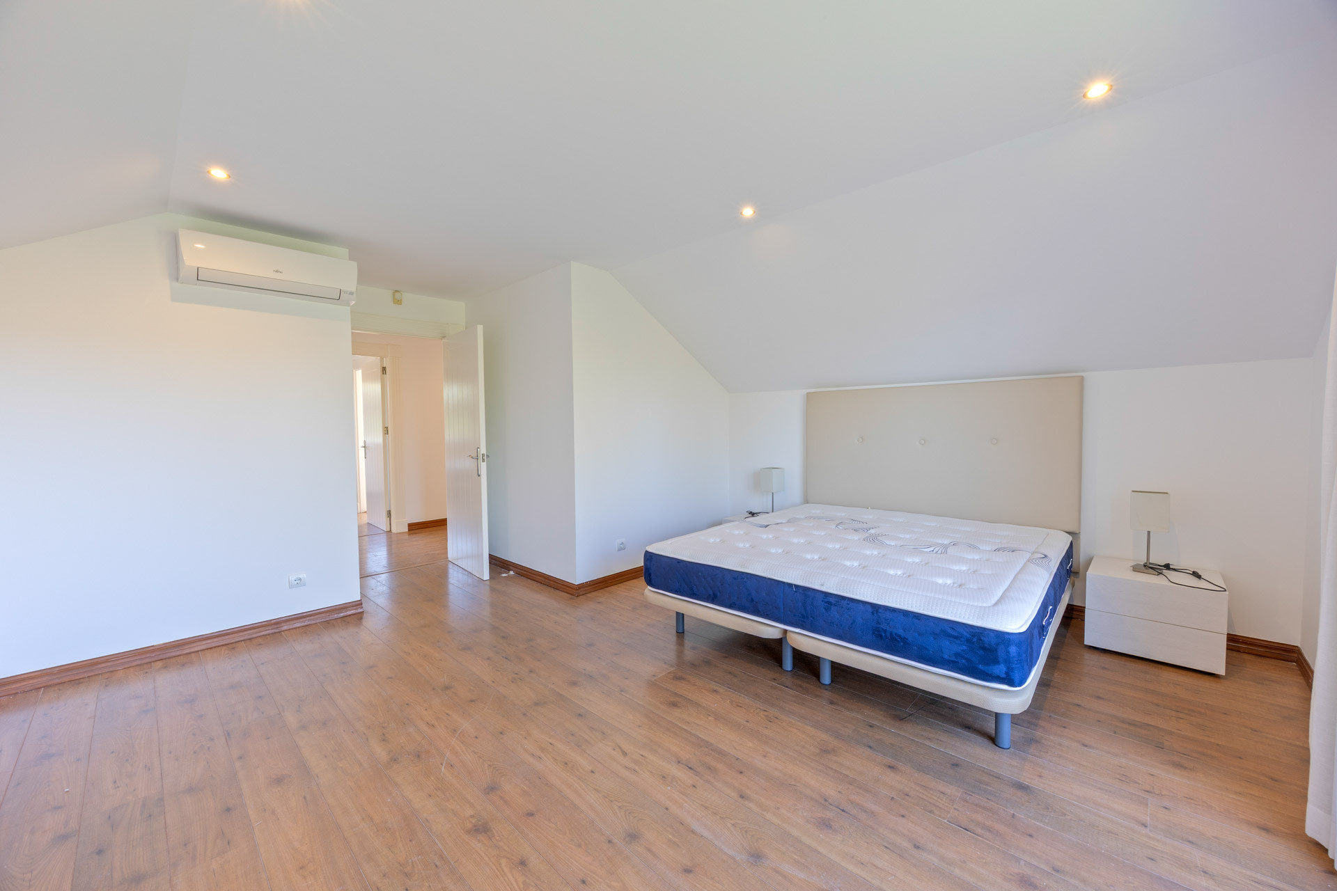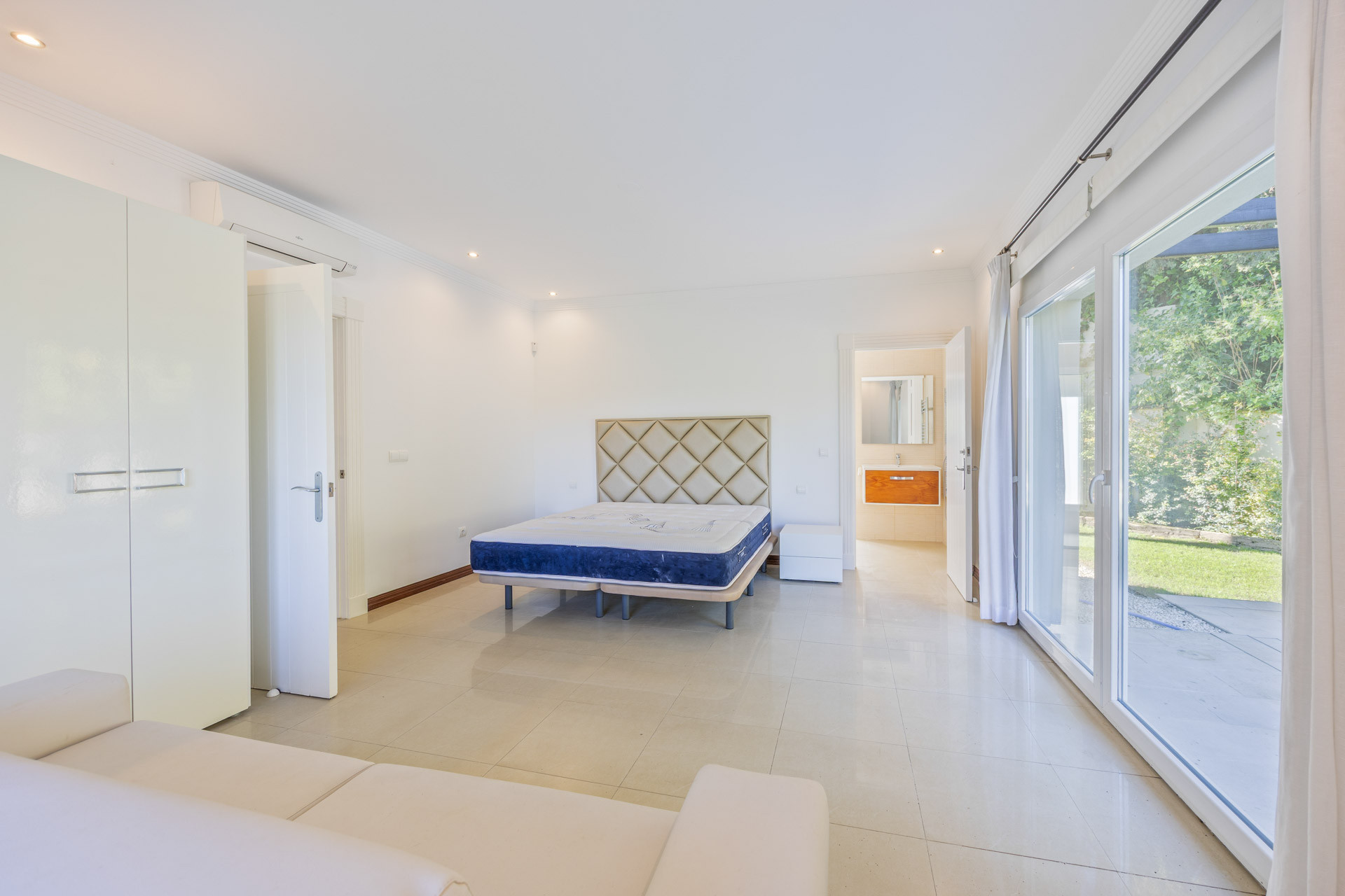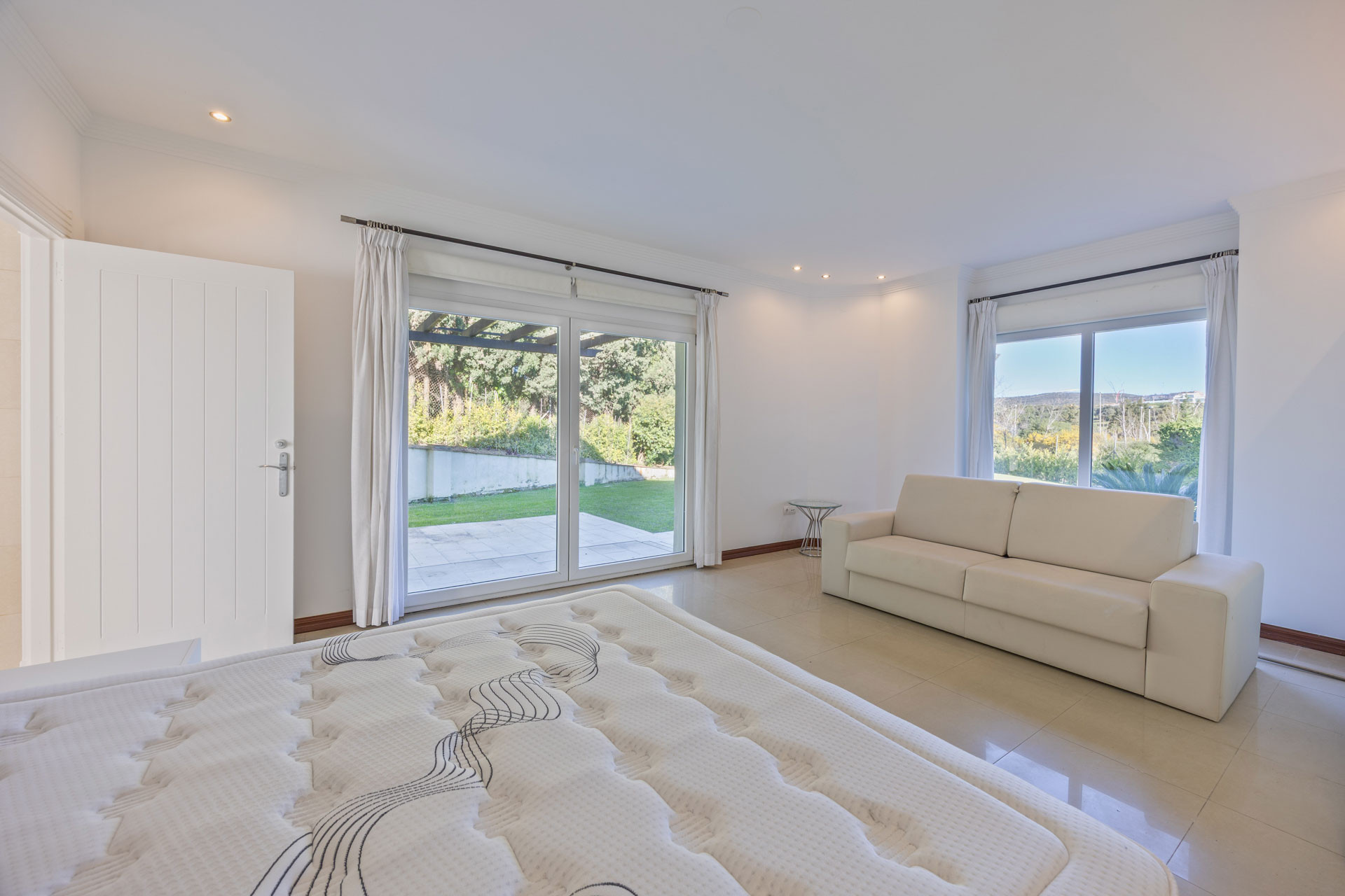 The villa comprises six bedrooms and five bathrooms, with the master suite standing out for its size, wooden flooring, and an en-suite bathroom with a freestanding tub that lends an elegant and relaxed atmosphere. All rooms are characterized by natural light, high ceilings, and a neutral palette that enhances the sense of calm and comfort.