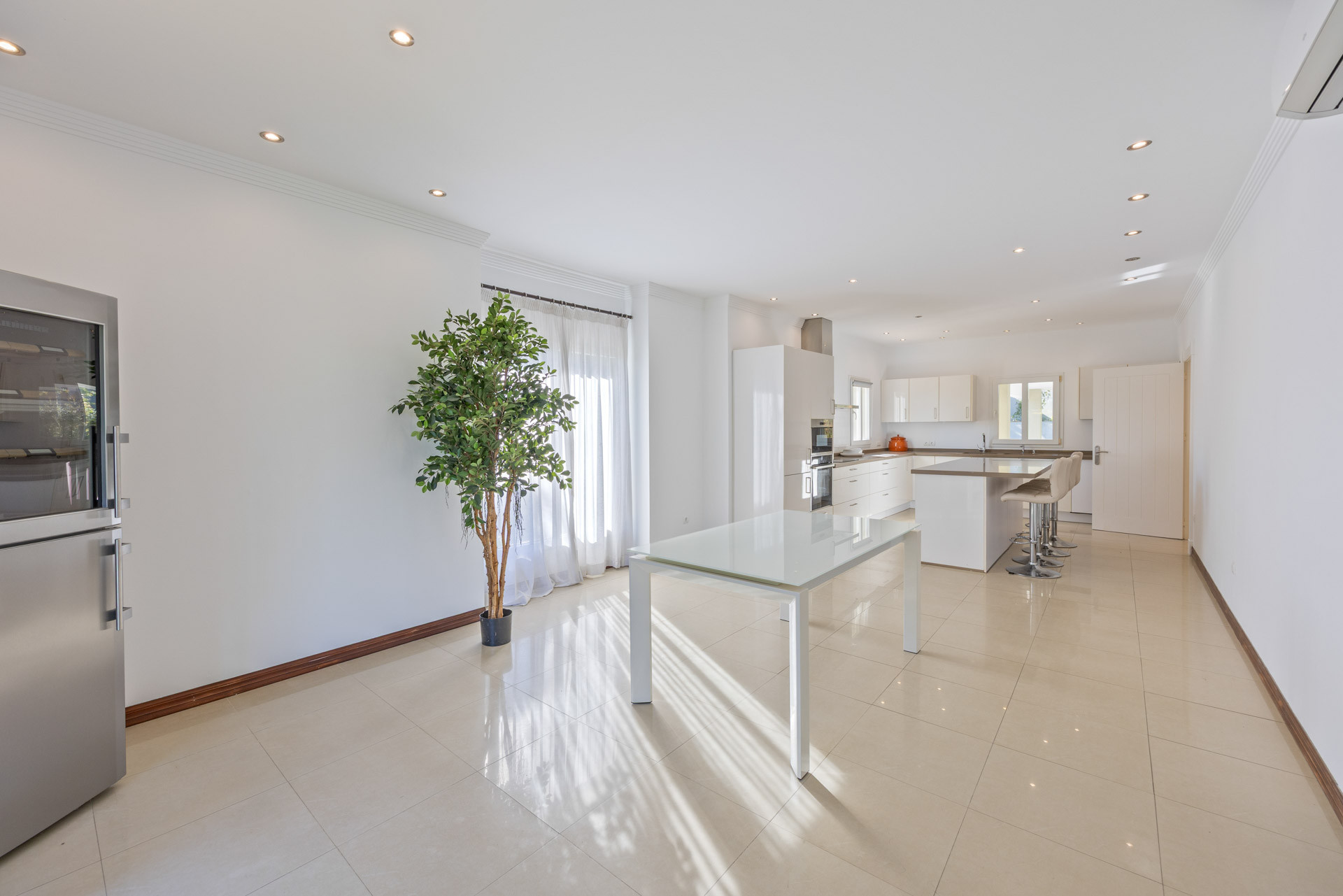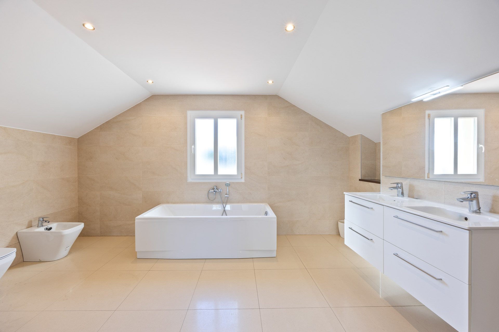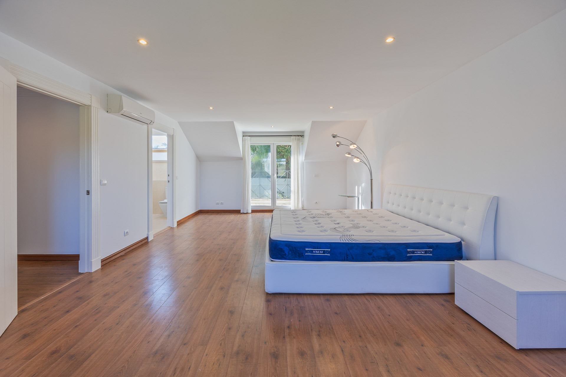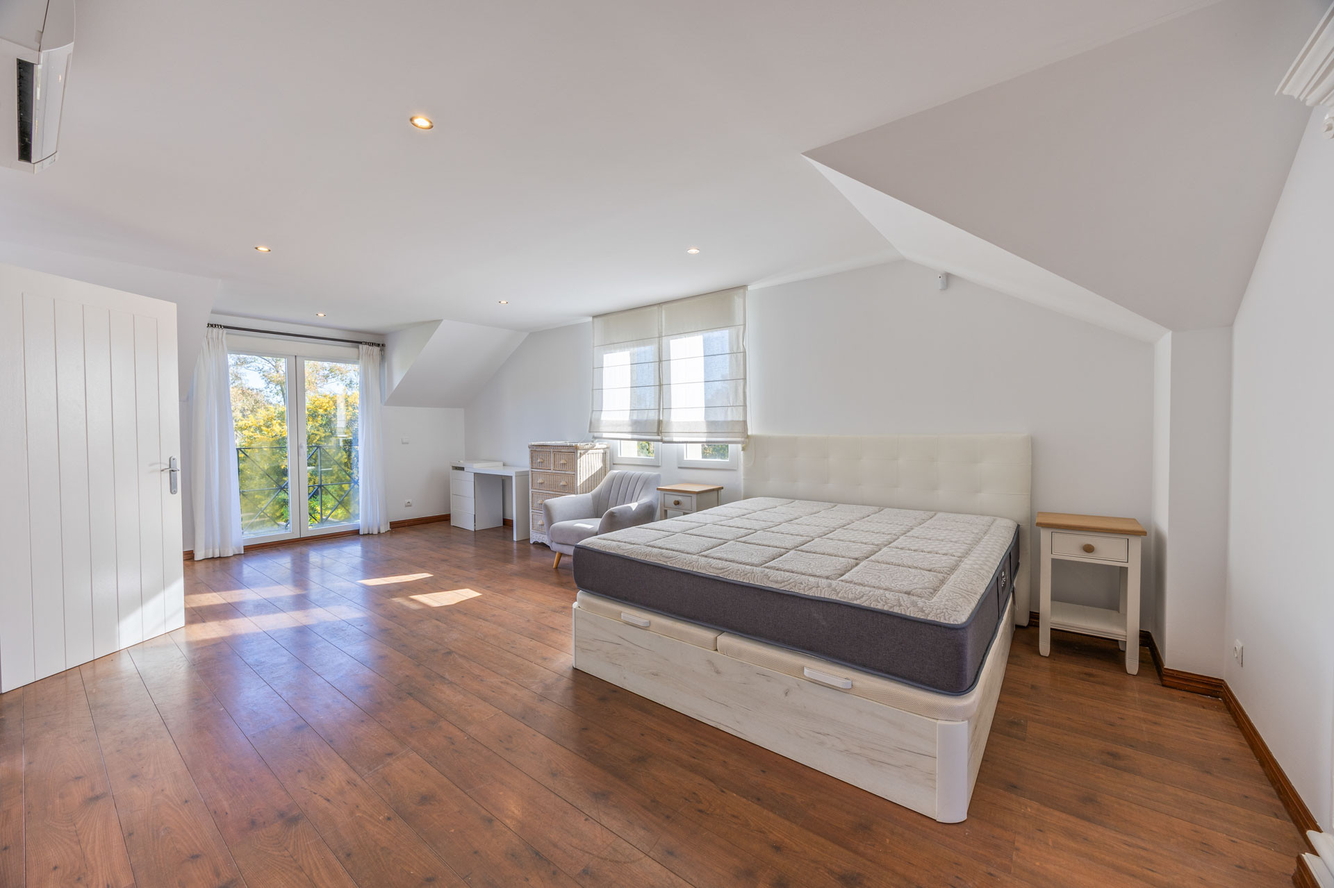 The villa comprises six bedrooms and five bathrooms, with the master suite standing out for its size, wooden flooring, and an en-suite bathroom with a freestanding tub that lends an elegant and relaxed atmosphere. All rooms are characterized by natural light, high ceilings, and a neutral palette that enhances the sense of calm and comfort.