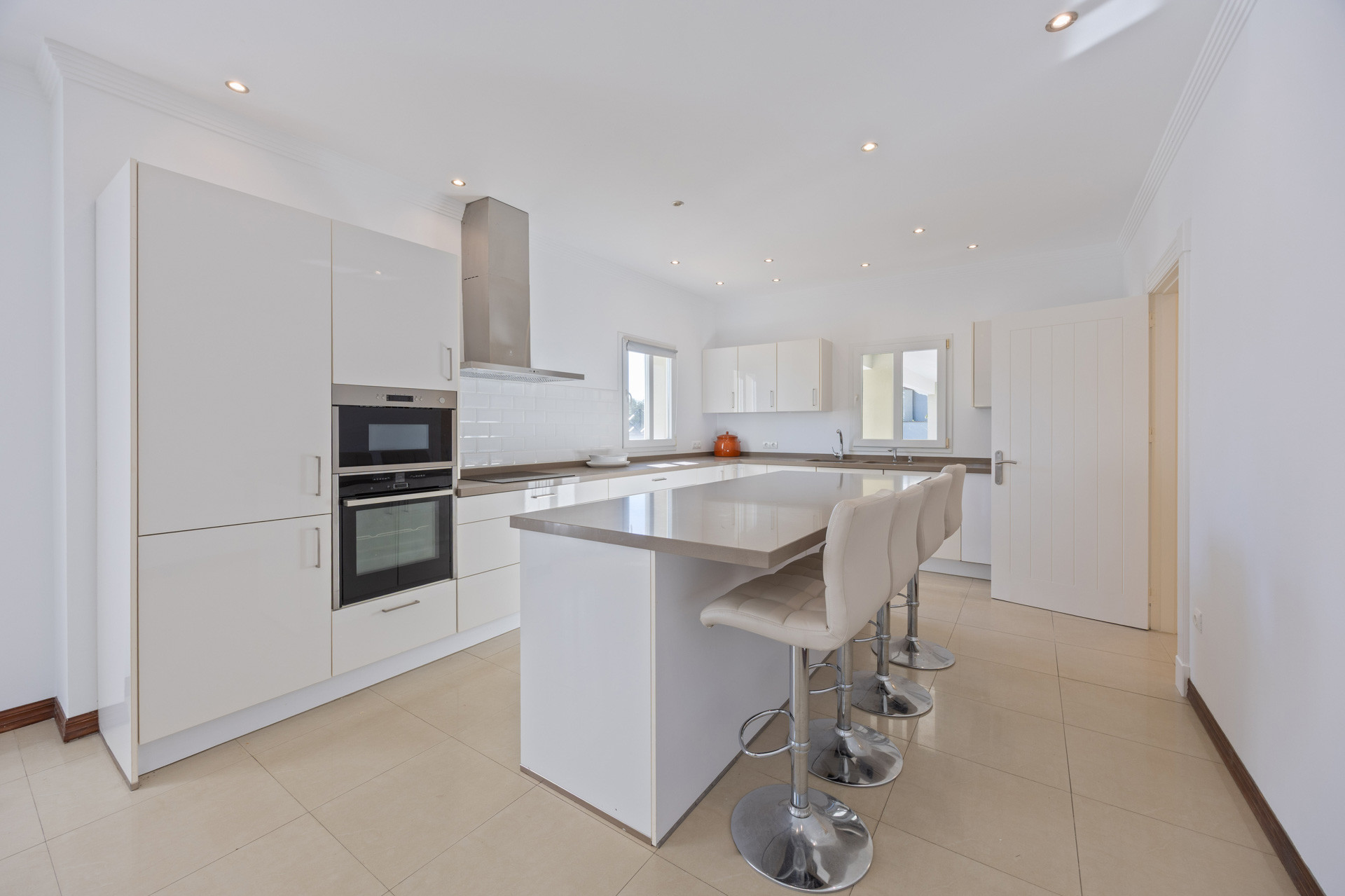 Inside, the home offers a classic and functional layout, with a built area of 400 m². The main entrance leads to an elegant hall with a central staircase, bringing a sense of balance and brightness. The main living room, spacious and welcoming, features a fireplace and direct access to the garden, while the large, modern, fully equipped kitchen-diner is arranged around a practical central island, ideal for both everyday living and entertaining guests.