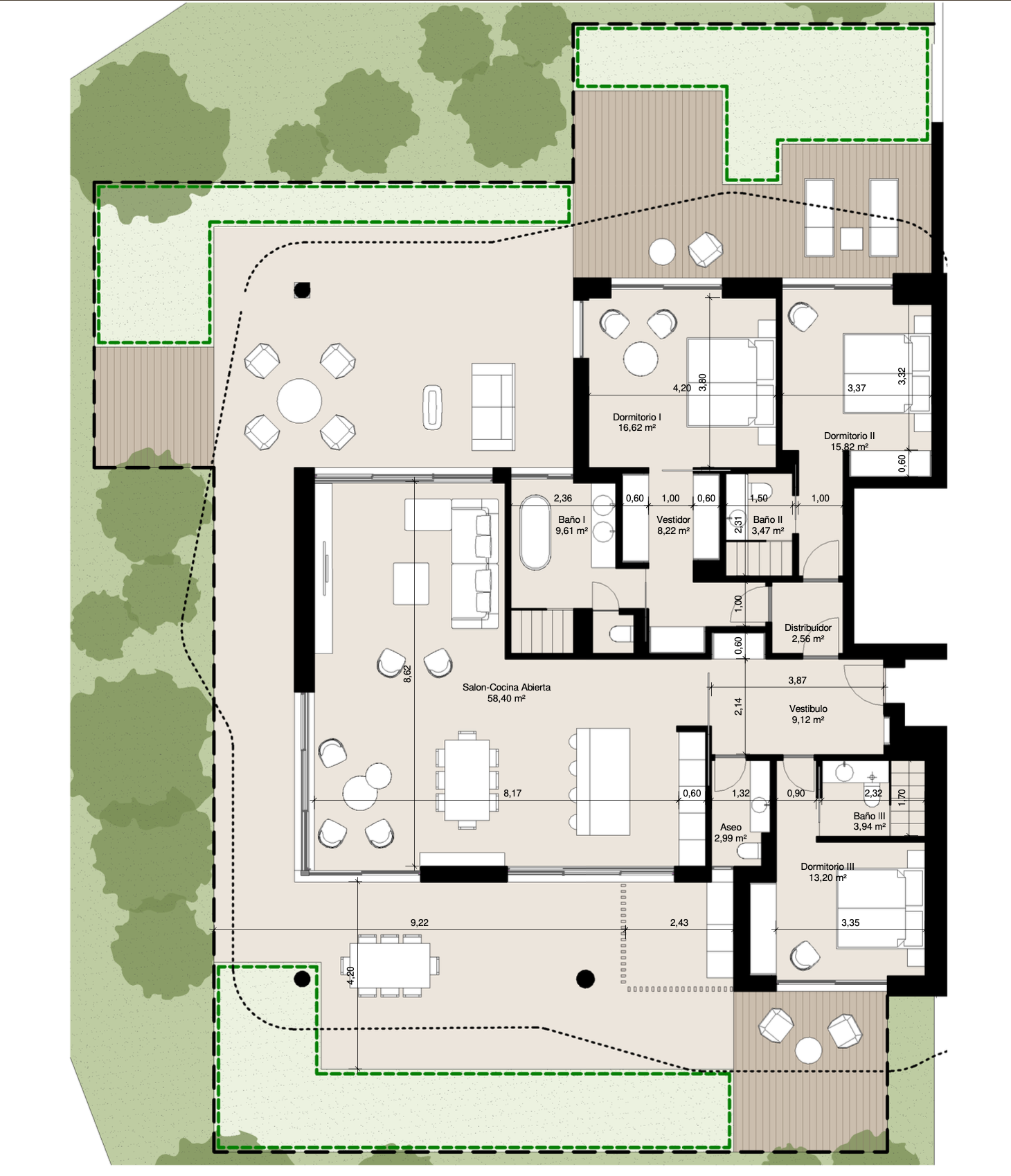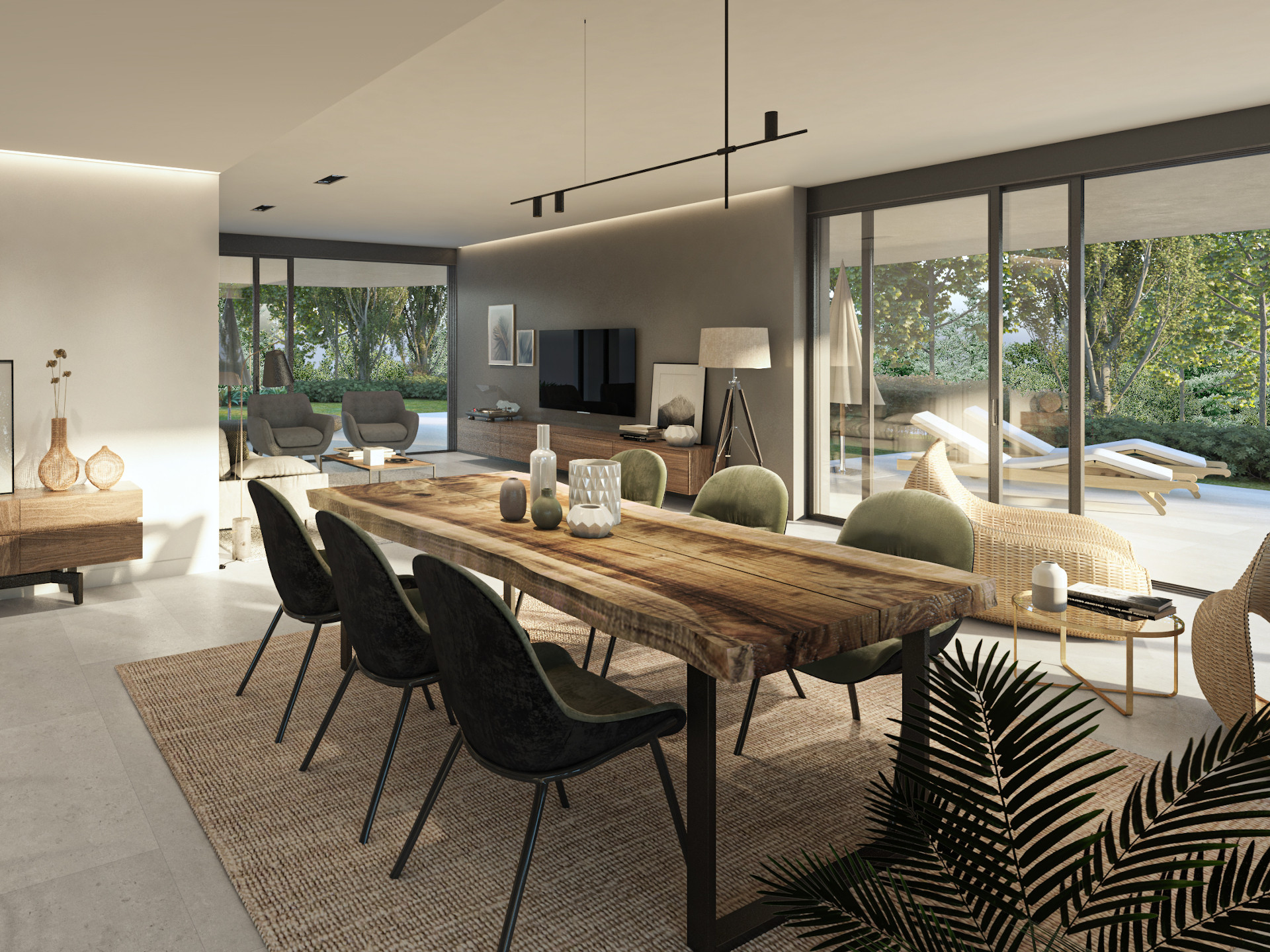 Situada entre maravillosos paisajes, frondosos bosques y parques ideales, cuenta con espacios abiertos y modernos que incluyen calefacción por suelo radiante y sistemas de aire acondicionado Aerotherm, interiores de diseño y elegantes con amplias terrazas que rodean el apartamento. Jardines de uso privativo para las propiedades de planta baja, como ocurre en esta vivienda.