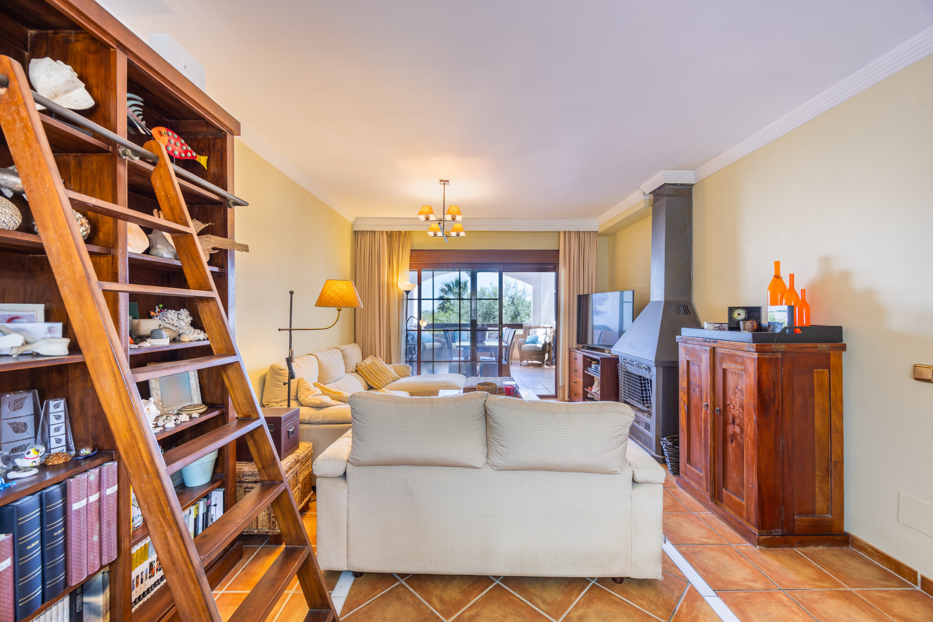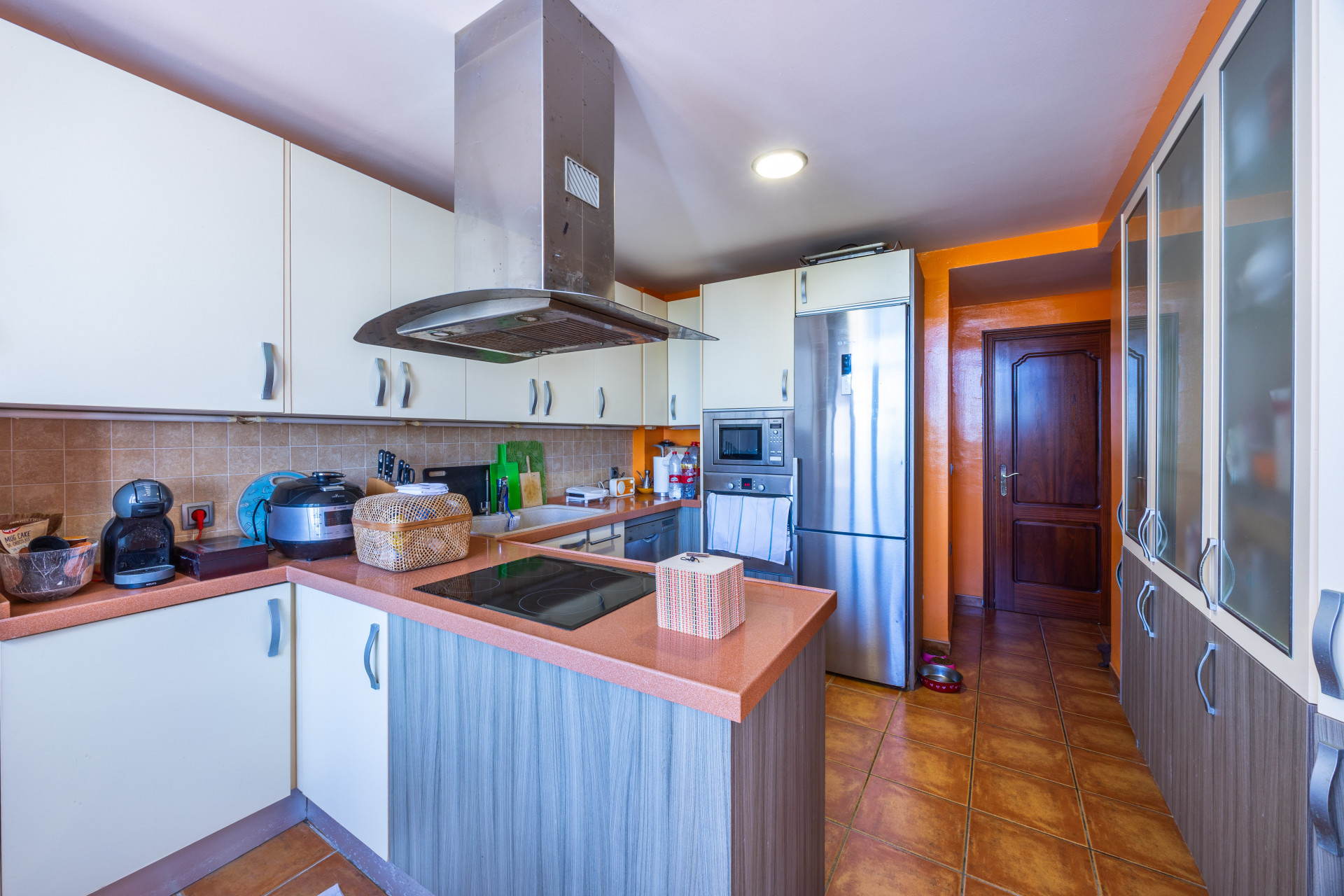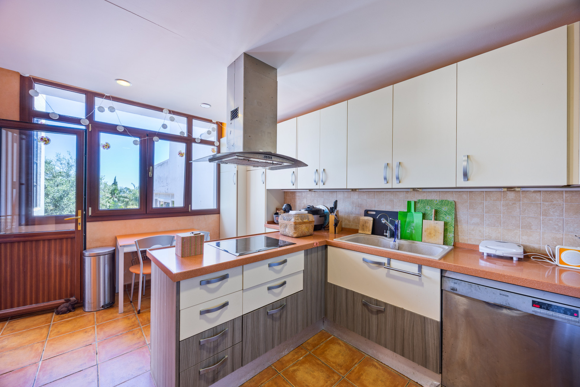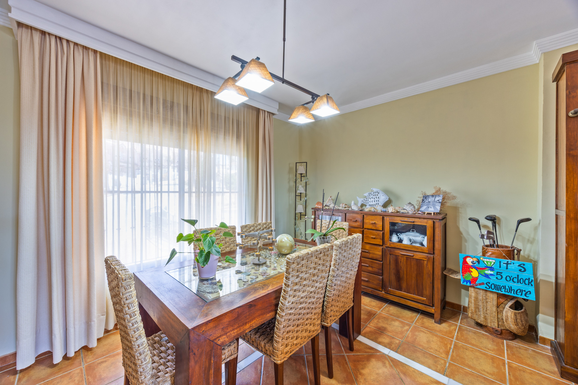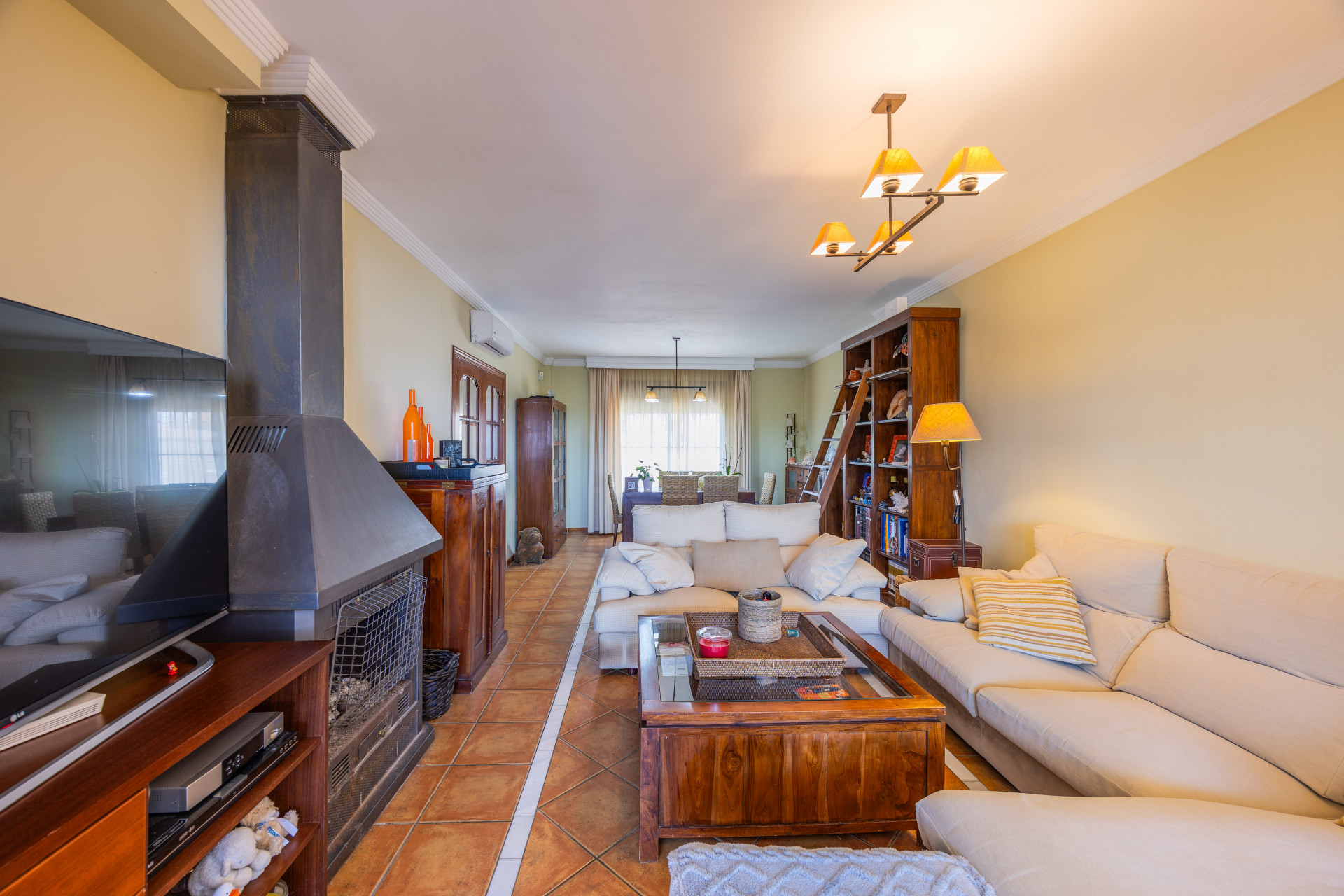 La propiedad se distribuye en tres plantas, ofreciendo espacios generosos y versátiles. En la planta principal encontramos un amplio salón-comedor con chimenea, aire acondicionado y salida directa a una terraza cubierta (que a su vez conecta con el patio y la cocina), perfecta para disfrutar del clima mediterráneo durante todo el año. La cocina, totalmente equipada, se comunica con esta zona exterior, ideal para reuniones familiares y cenas al aire libre.