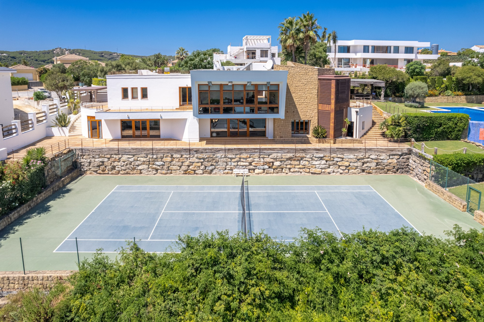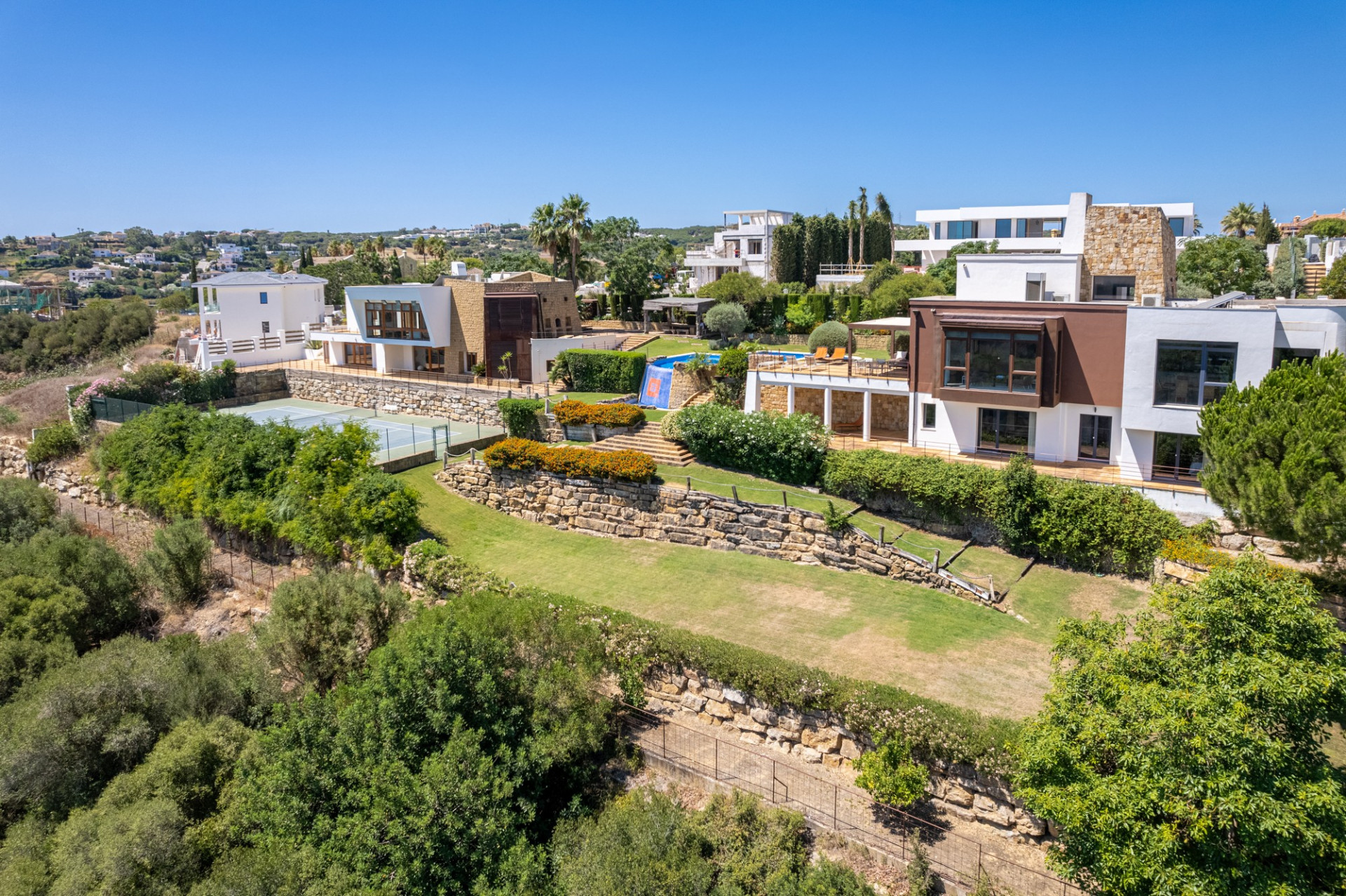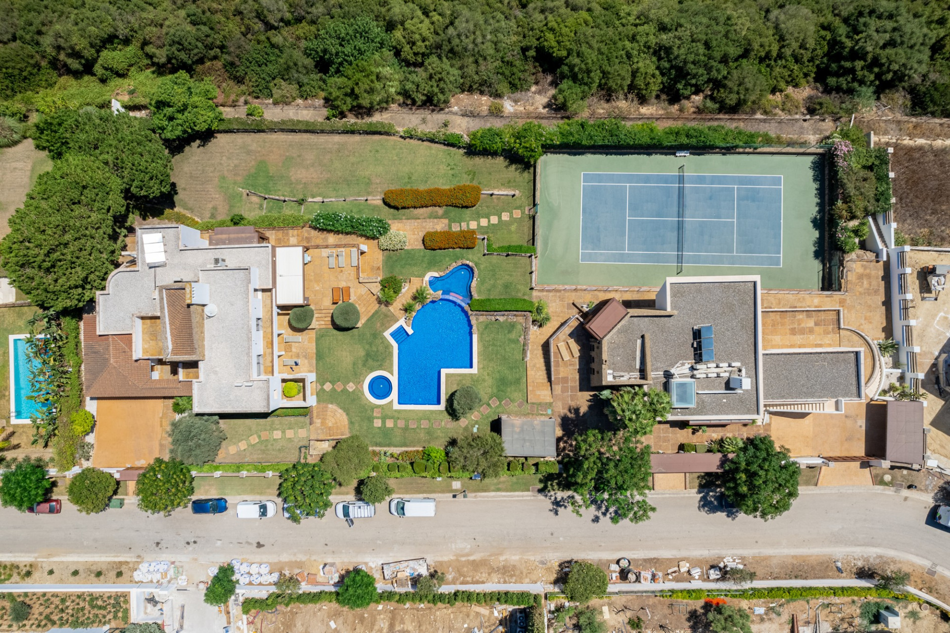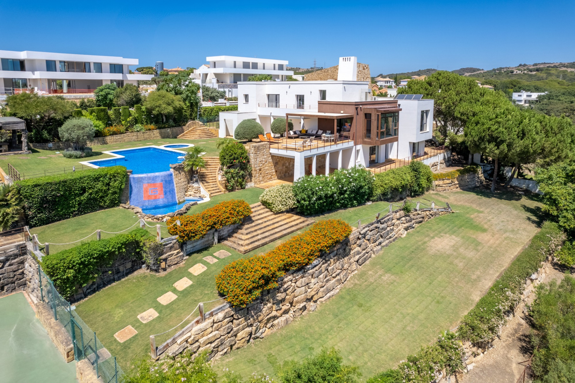 El jardín compartido ha sido diseñado meticulosamente, ofreciendo múltiples terrazas en ambas propiedades. La piscina de doble nivel con jacuzzi, duchas al aire libre, la pista de tenis de tamaño profesional y la zona de barbacoa con un comedor sombreado, junto con una terraza en la azotea, completan un espacio perfecto para disfrutar del entorno e instalaciones.