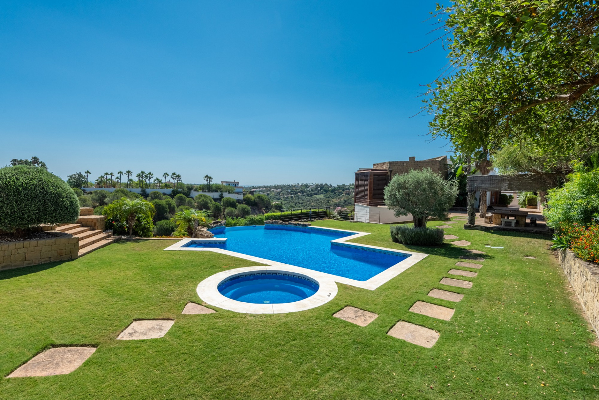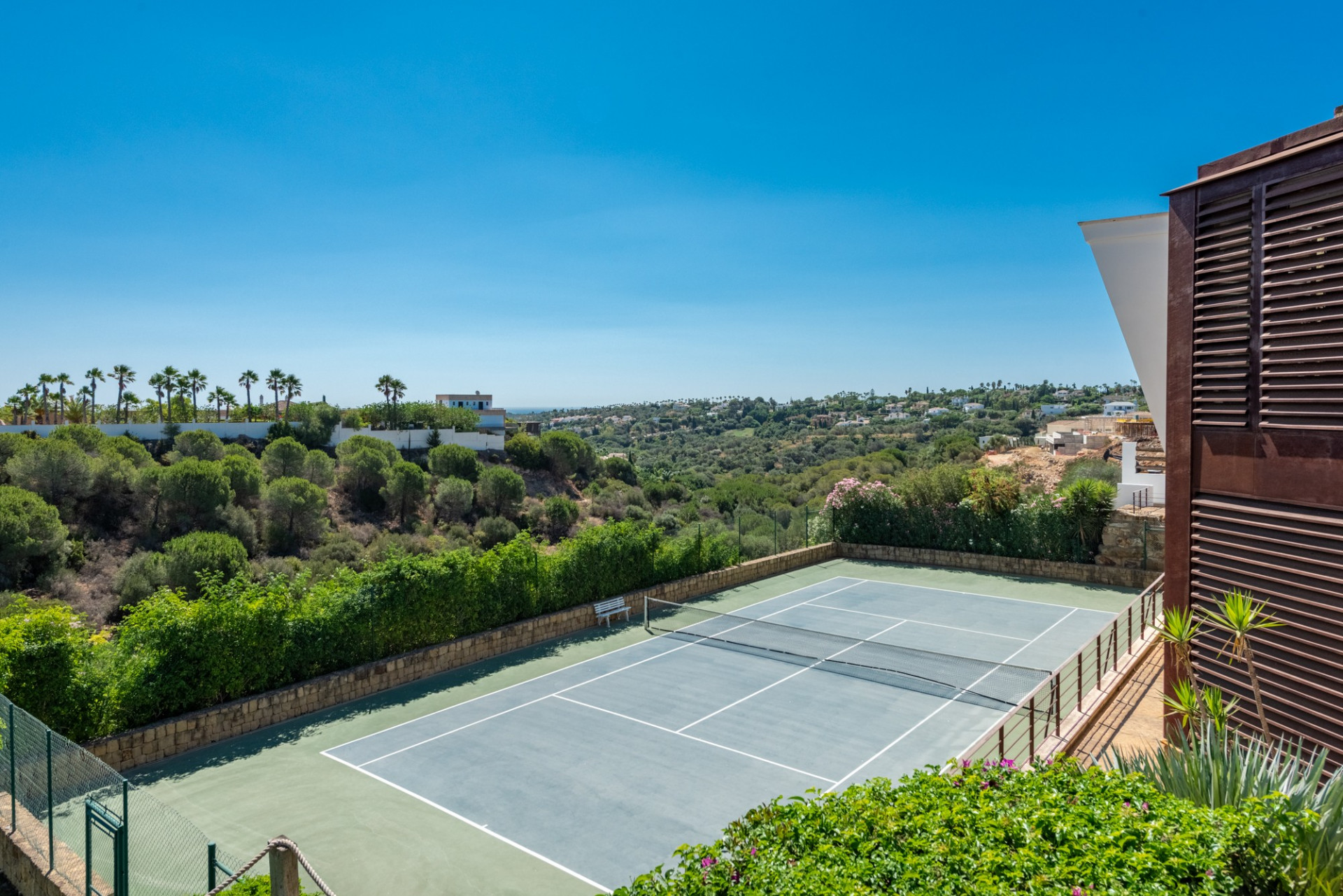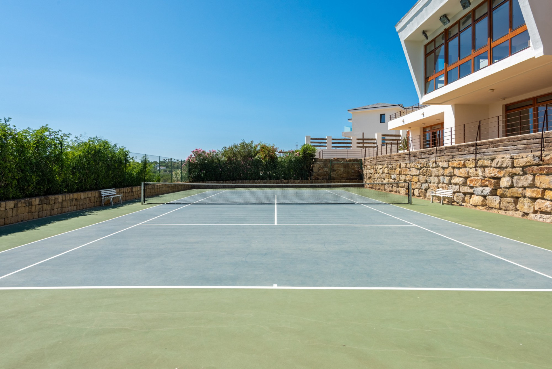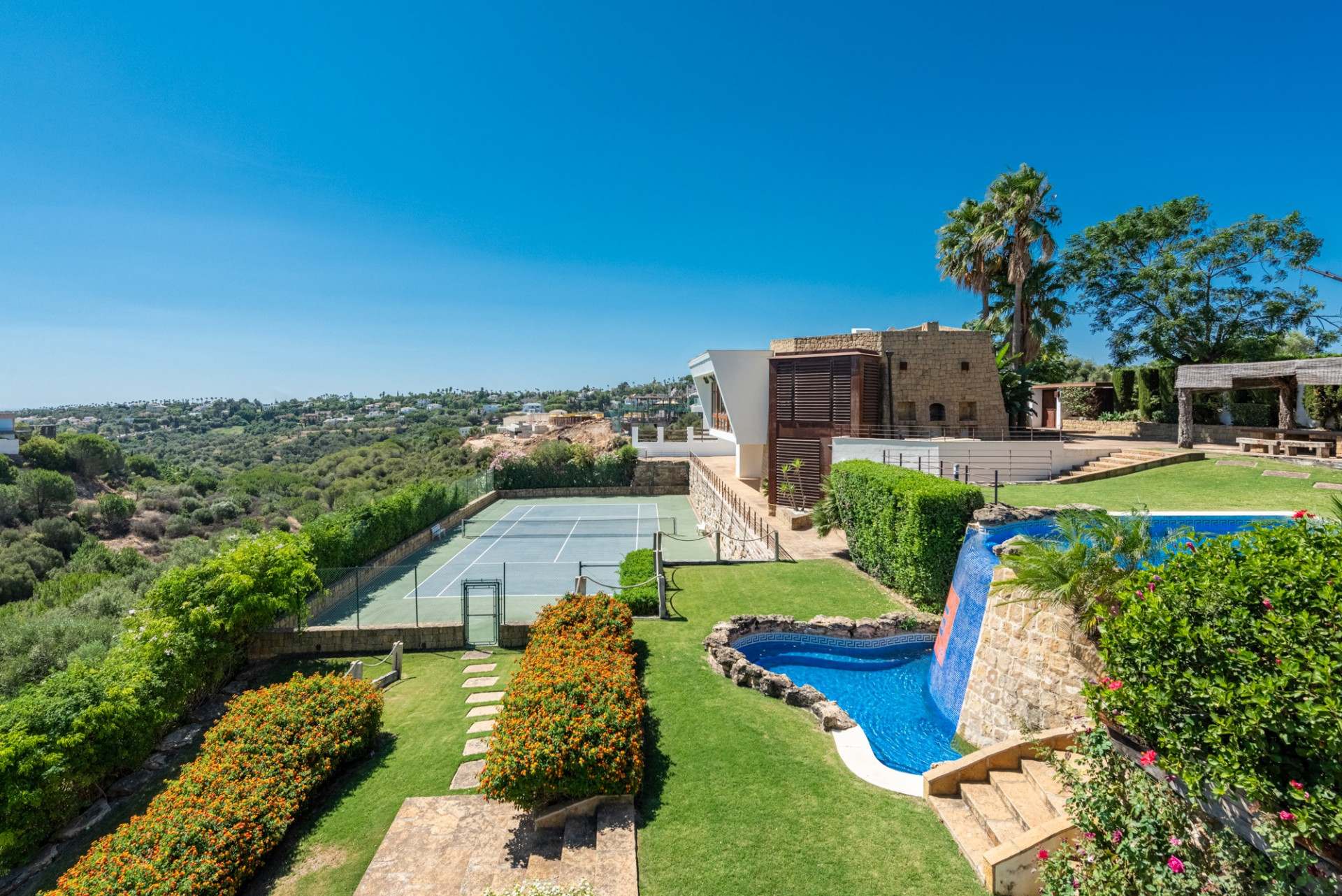 El jardín compartido ha sido diseñado meticulosamente, ofreciendo múltiples terrazas en ambas propiedades. La piscina de doble nivel con jacuzzi, duchas al aire libre, la pista de tenis de tamaño profesional y la zona de barbacoa con un comedor sombreado, junto con una terraza en la azotea, completan un espacio perfecto para disfrutar del entorno e instalaciones.