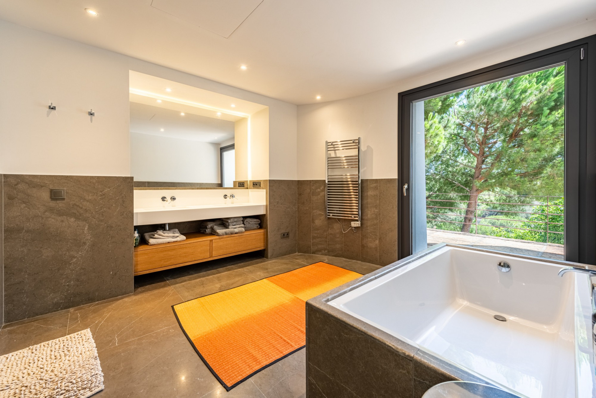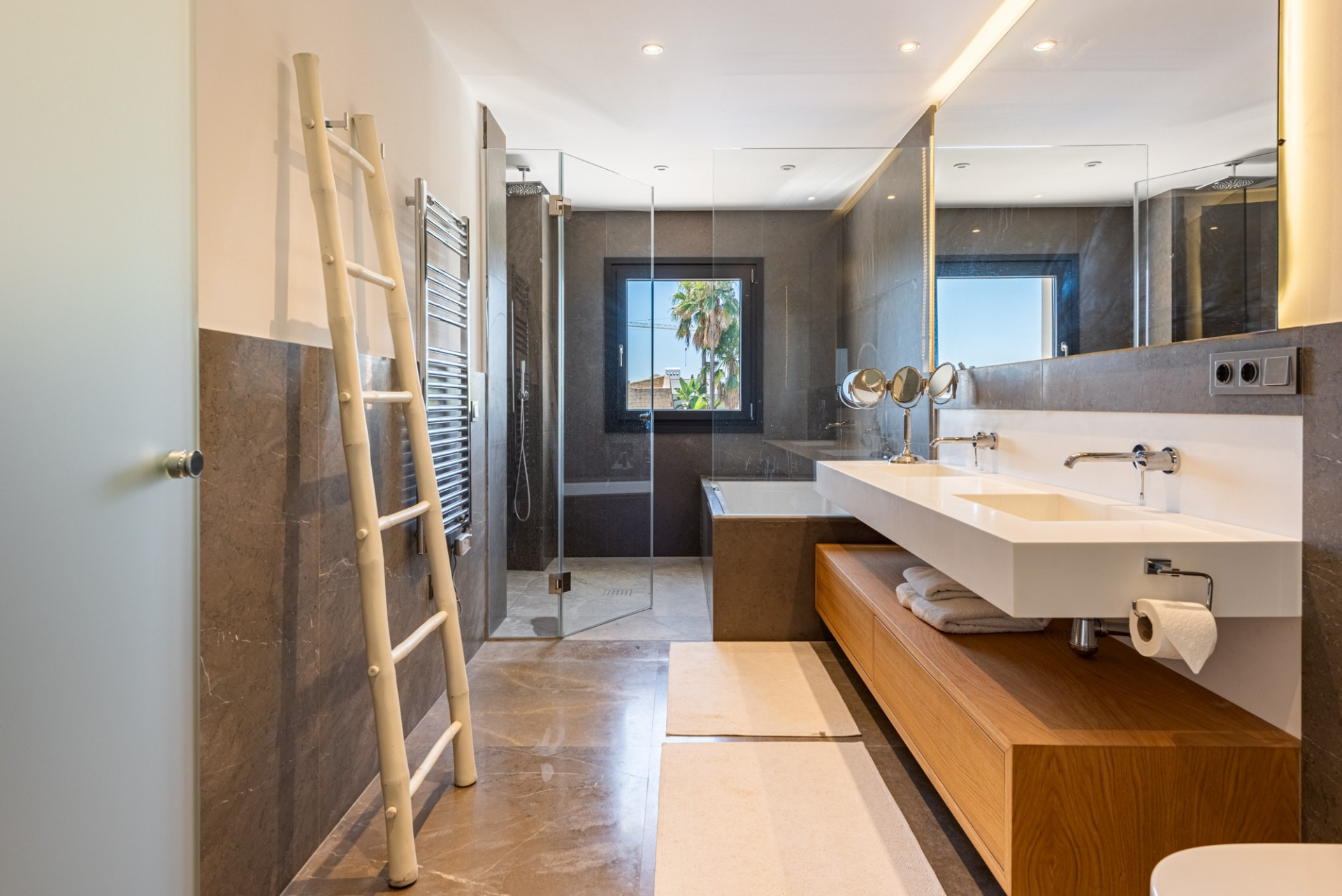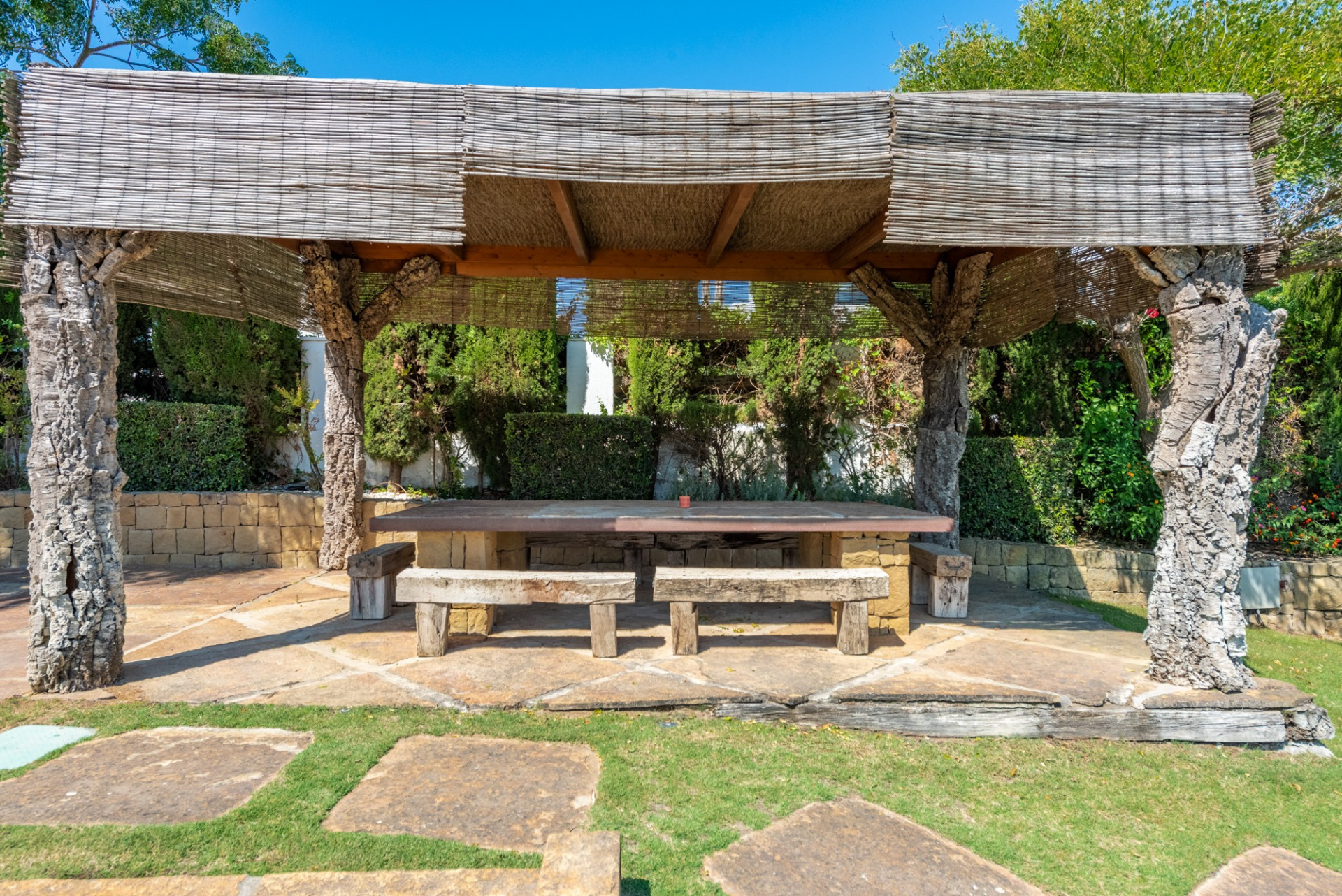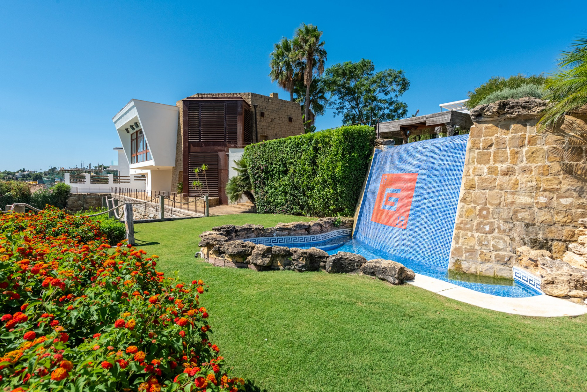 El jardín compartido ha sido diseñado meticulosamente, ofreciendo múltiples terrazas en ambas propiedades. La piscina de doble nivel con jacuzzi, duchas al aire libre, la pista de tenis de tamaño profesional y la zona de barbacoa con un comedor sombreado, junto con una terraza en la azotea, completan un espacio perfecto para disfrutar del entorno e instalaciones.