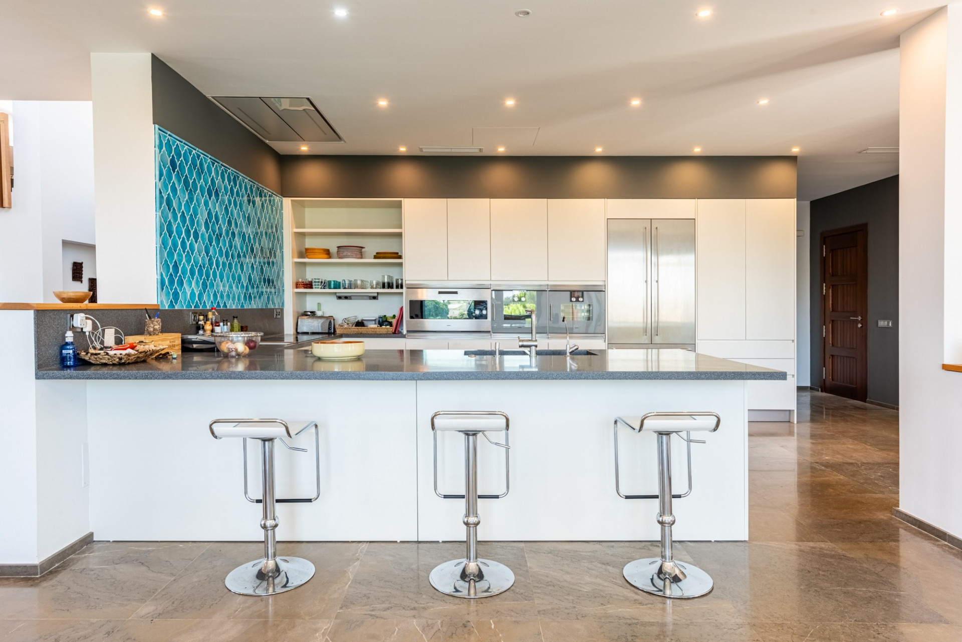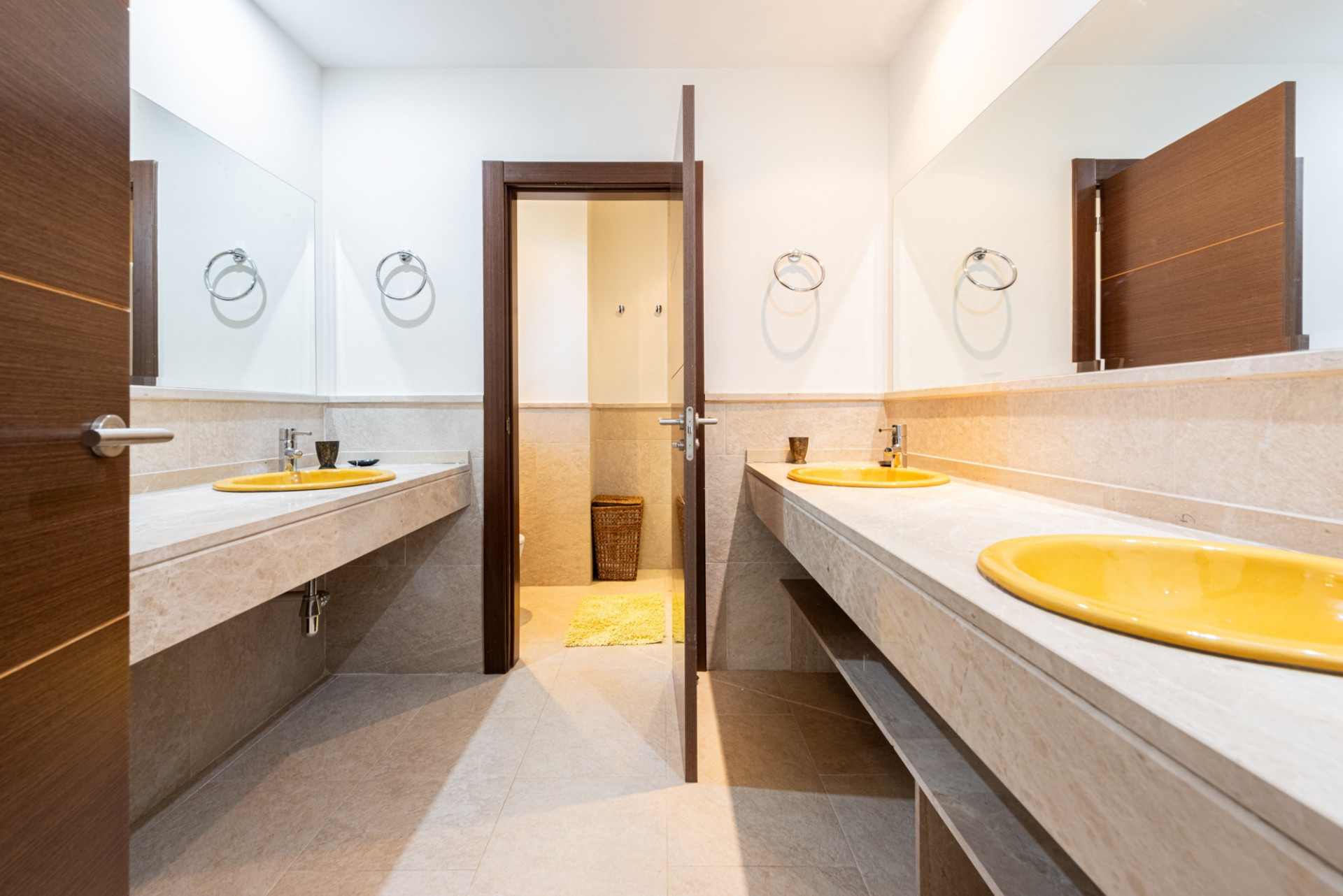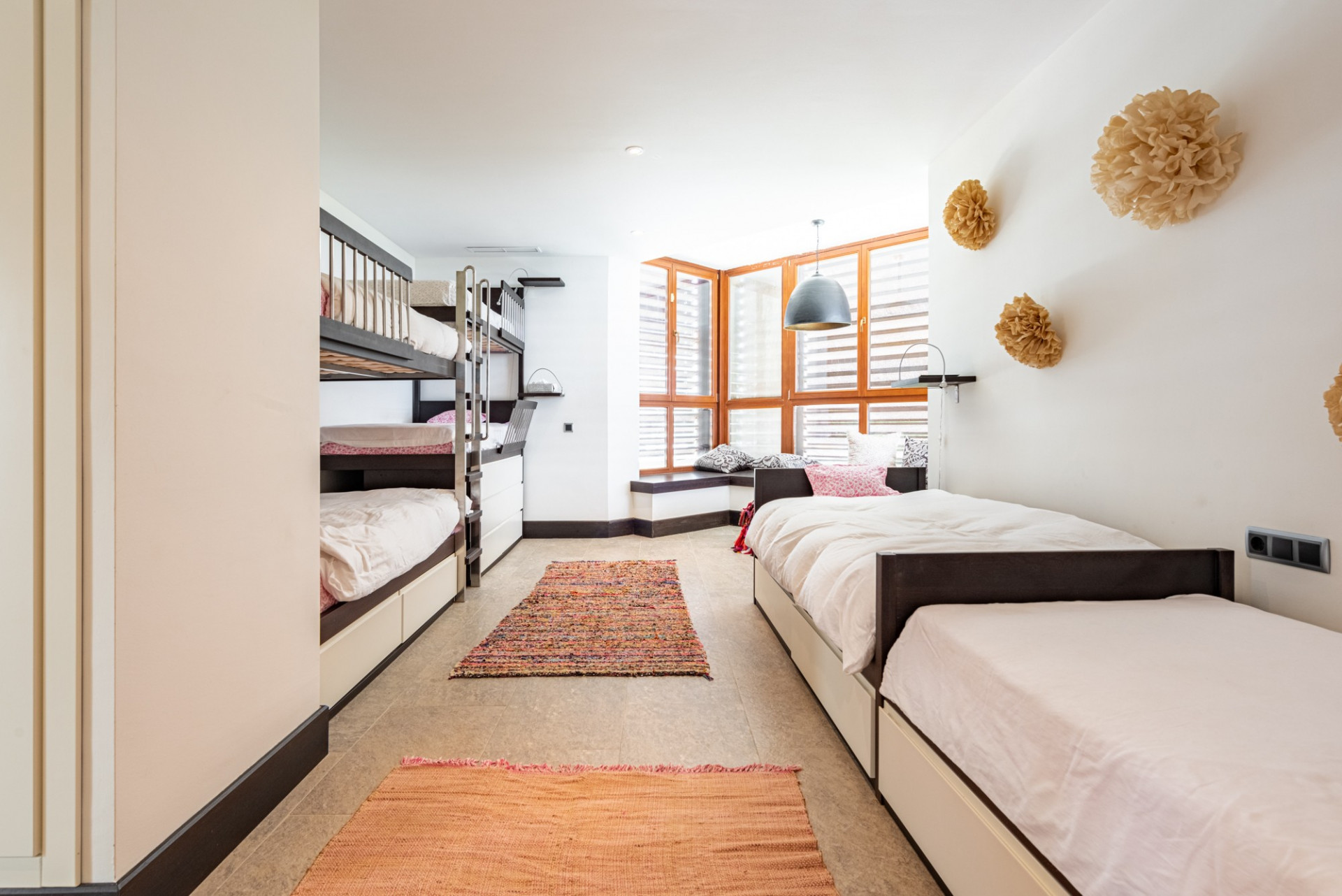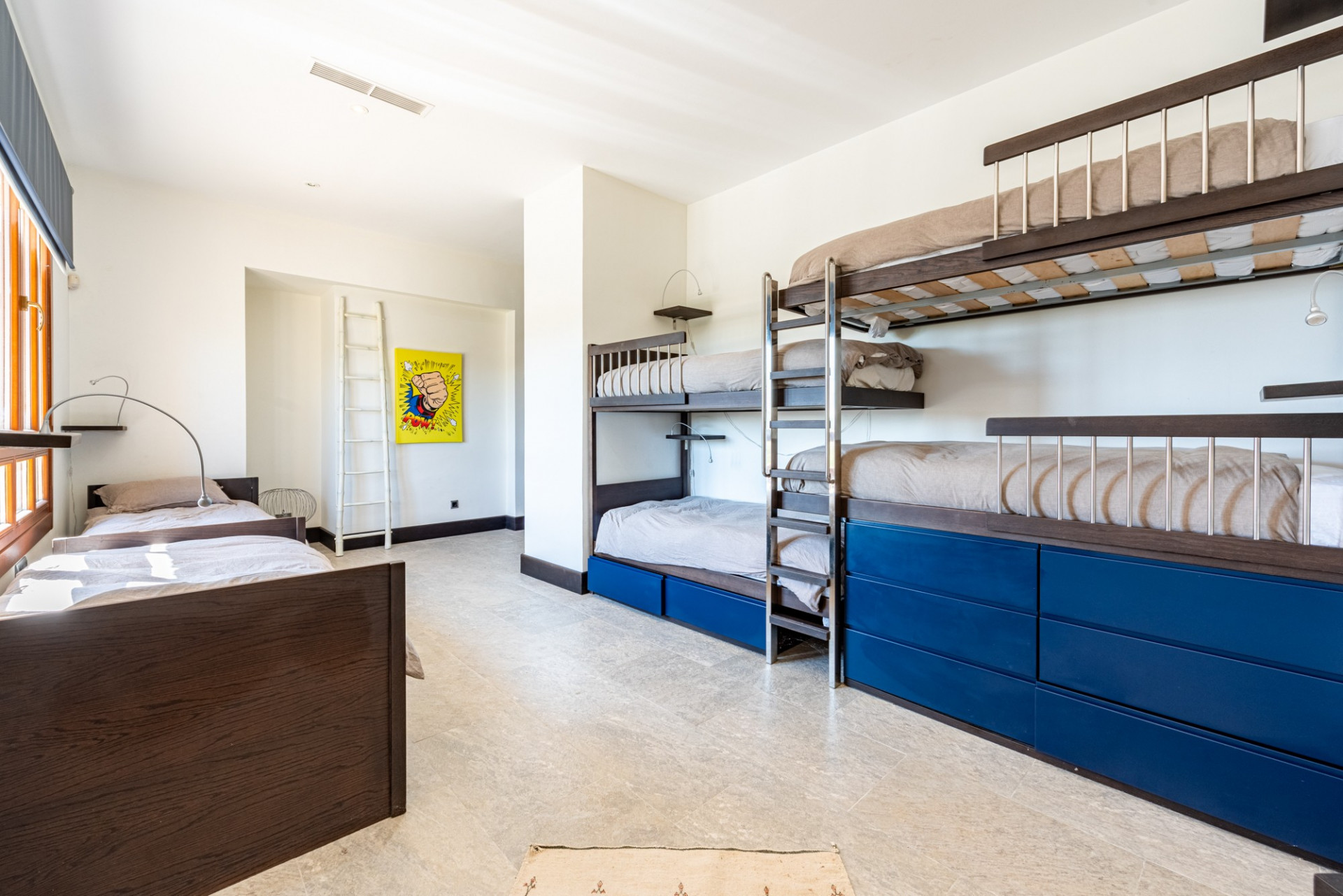 Por otro lado, la segunda villa alberga un dormitorio principal en suite y dos dormitorios espaciosos, actualmente utilizados como habitaciones infantiles, cada una con literas y amplios baños con cuatro lavabos. Esta villa cuenta con una cocina completamente equipada, una amplia sala de televisión, sala de juegos y gimnasio. Es una opción fabulosa para adolescentes que buscan su propio espacio o para los invitados que desean privacidad en una villa independiente.