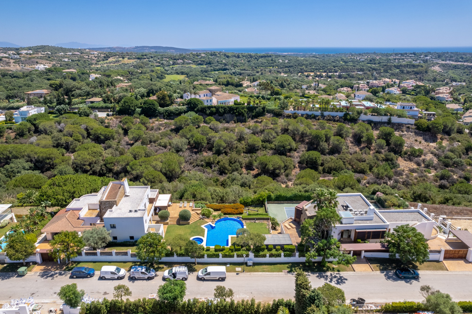 Esta es una exclusiva oportunidad en el corazón de Sotogrande, donde dos espléndidas villas comparten una impresionante parcela con increíbles jardines, piscina y una cancha de tenis de primera categoría. Ambas propiedades ofrecen vistas elevadas y despejadas hacia la naturaleza protegida y el inmenso mar en el horizonte. Ubicadas en una de las pocas calles que facilitan el acceso a pie a la Colegio Internacional, estas villas son ideales para familias que buscan comodidad y calidad de vida.