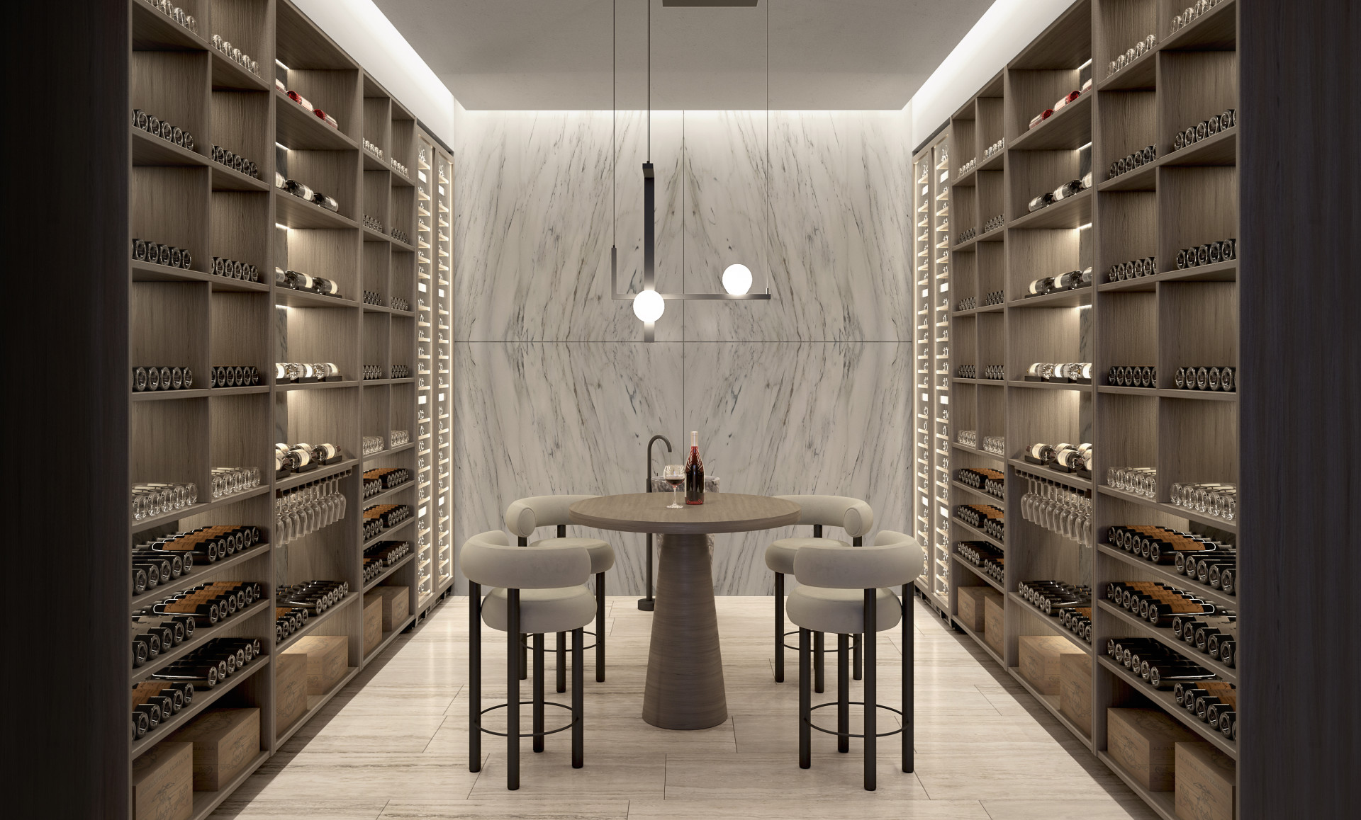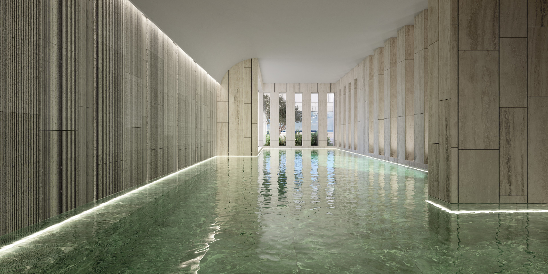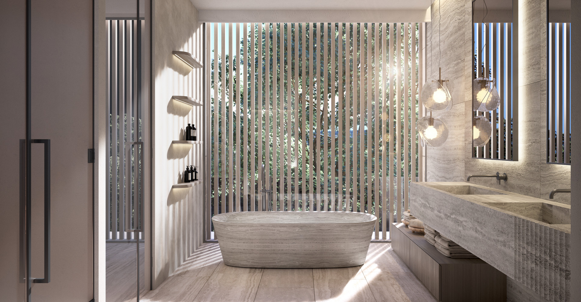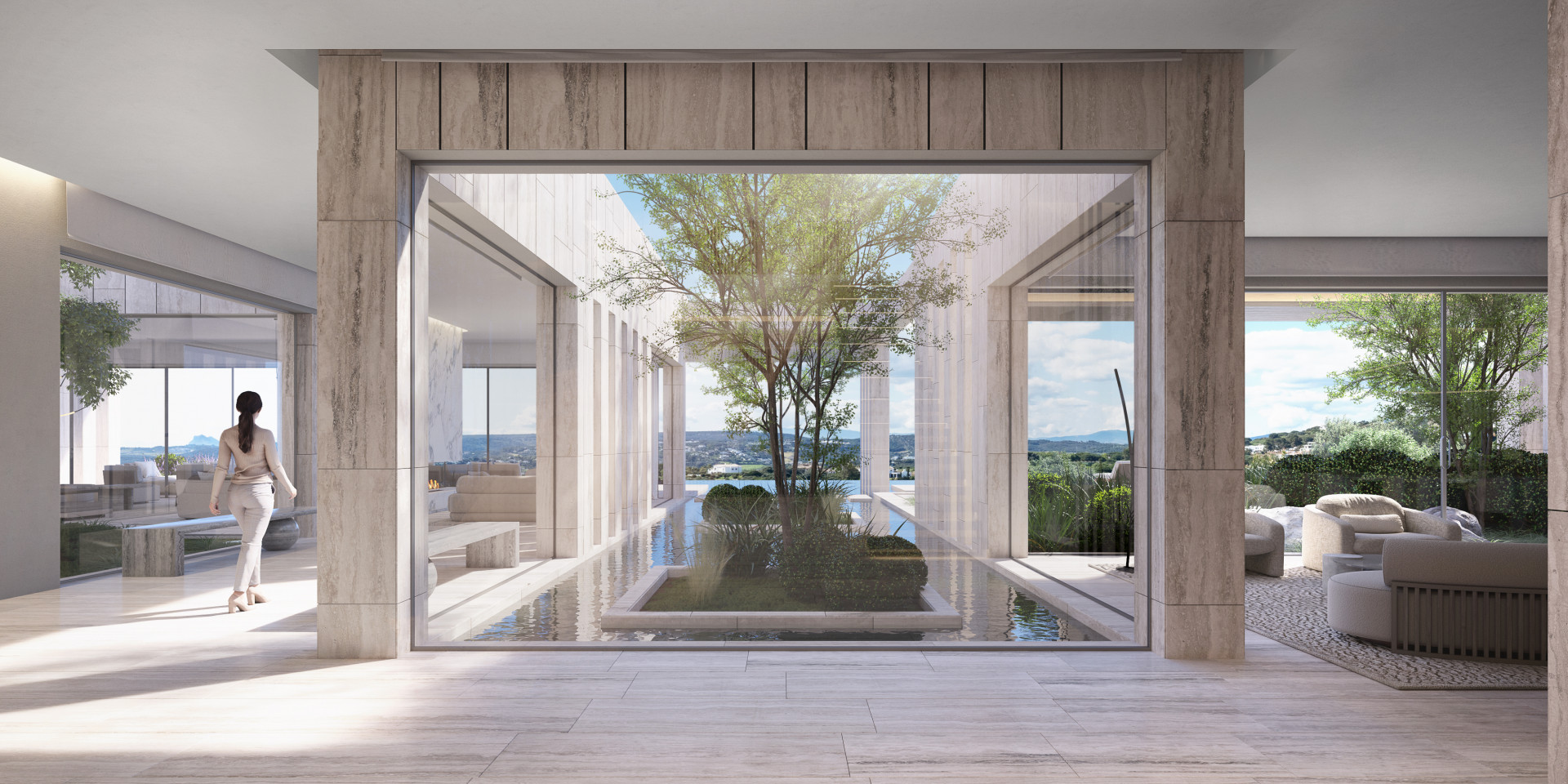 Los materiales naturales —como la piedra travertina, la madera maciza y mármoles nobles— han sido seleccionados cuidadosamente para dotar a cada espacio de una atmósfera serena y atemporal. La arquitectura se funde con el terreno a través de jardines mediterráneos con vegetación autóctona y una piscina exterior infinity que parece flotar sobre el horizonte.