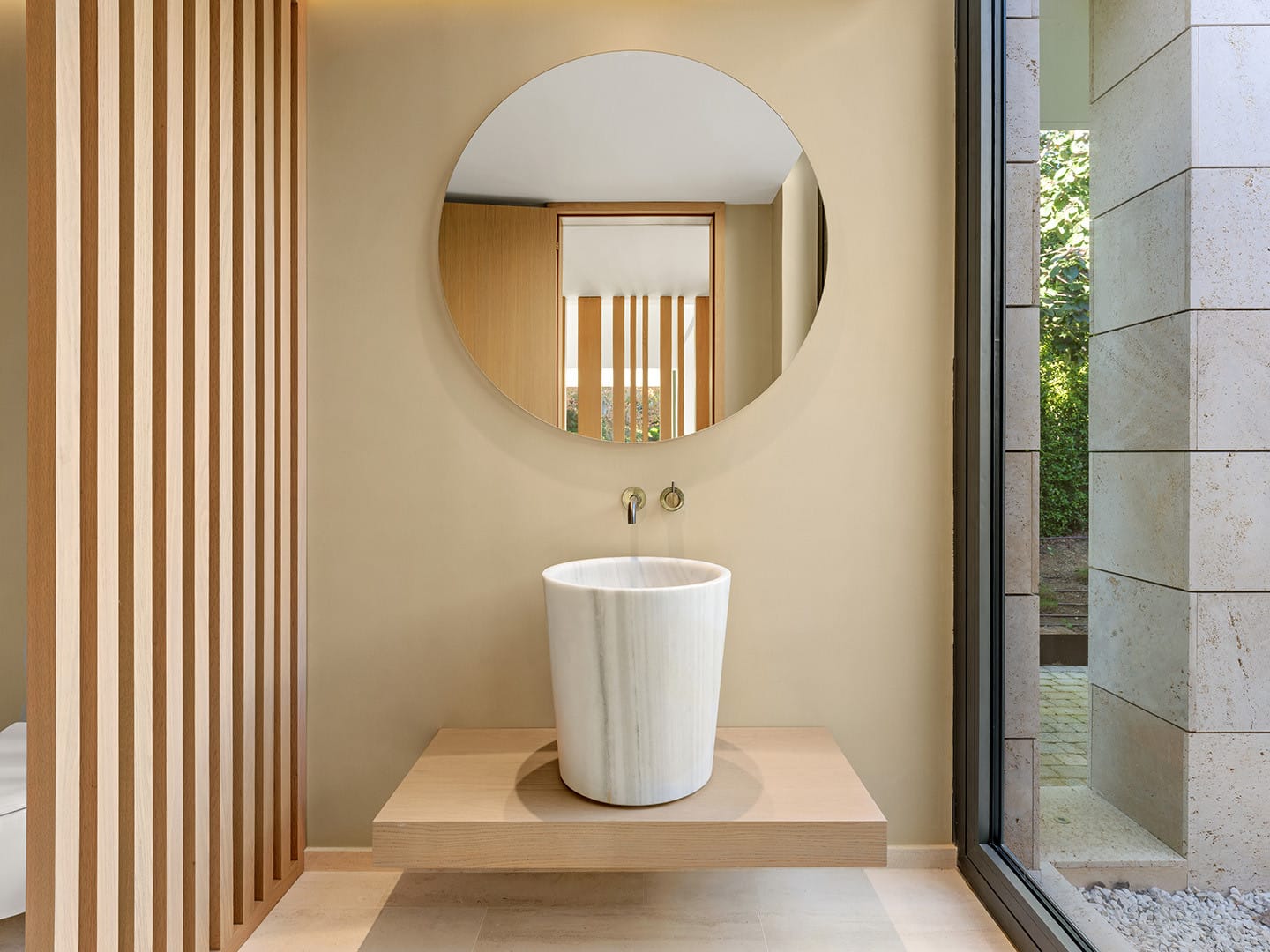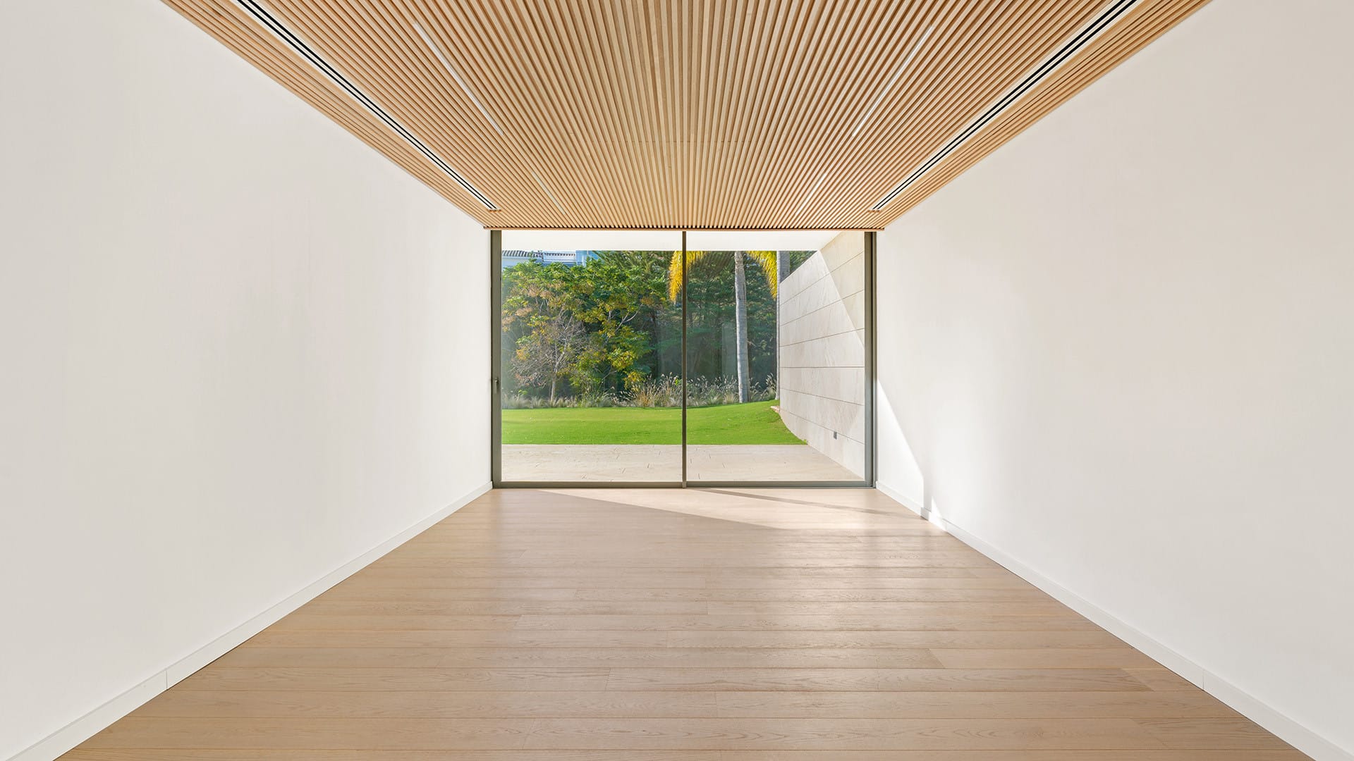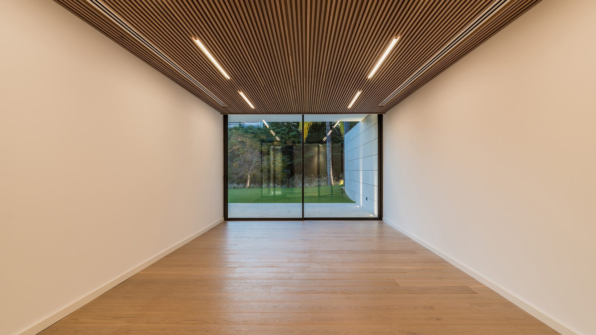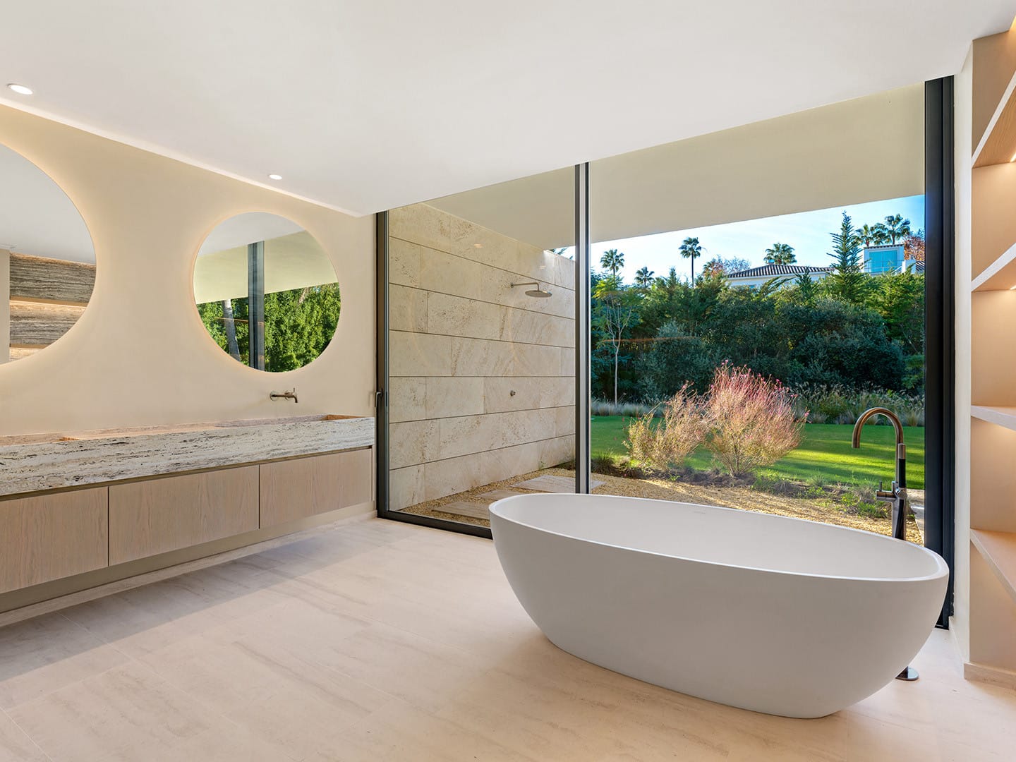 En la planta inferior, la suite principal se convierte en un santuario íntimo con vestidor, baño en suite y ducha exterior rodeada de vegetación. En este nivel, los espacios adicionales permiten diseñar un spa privado, gimnasio, cine o bodega, adaptándose a las necesidades y estilo de vida de quienes lo habiten.