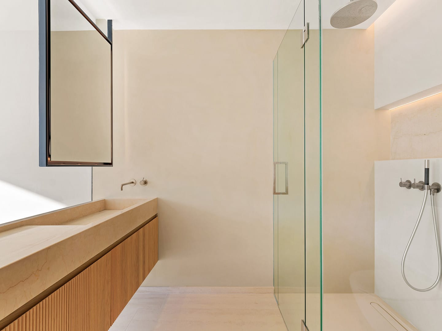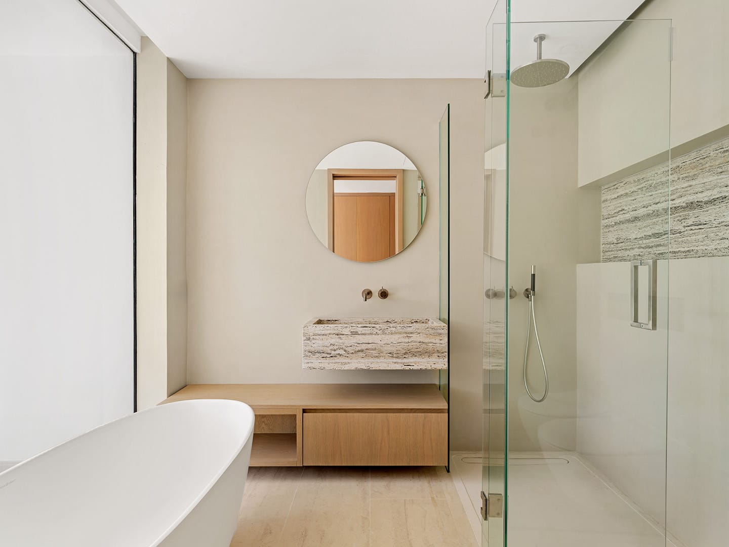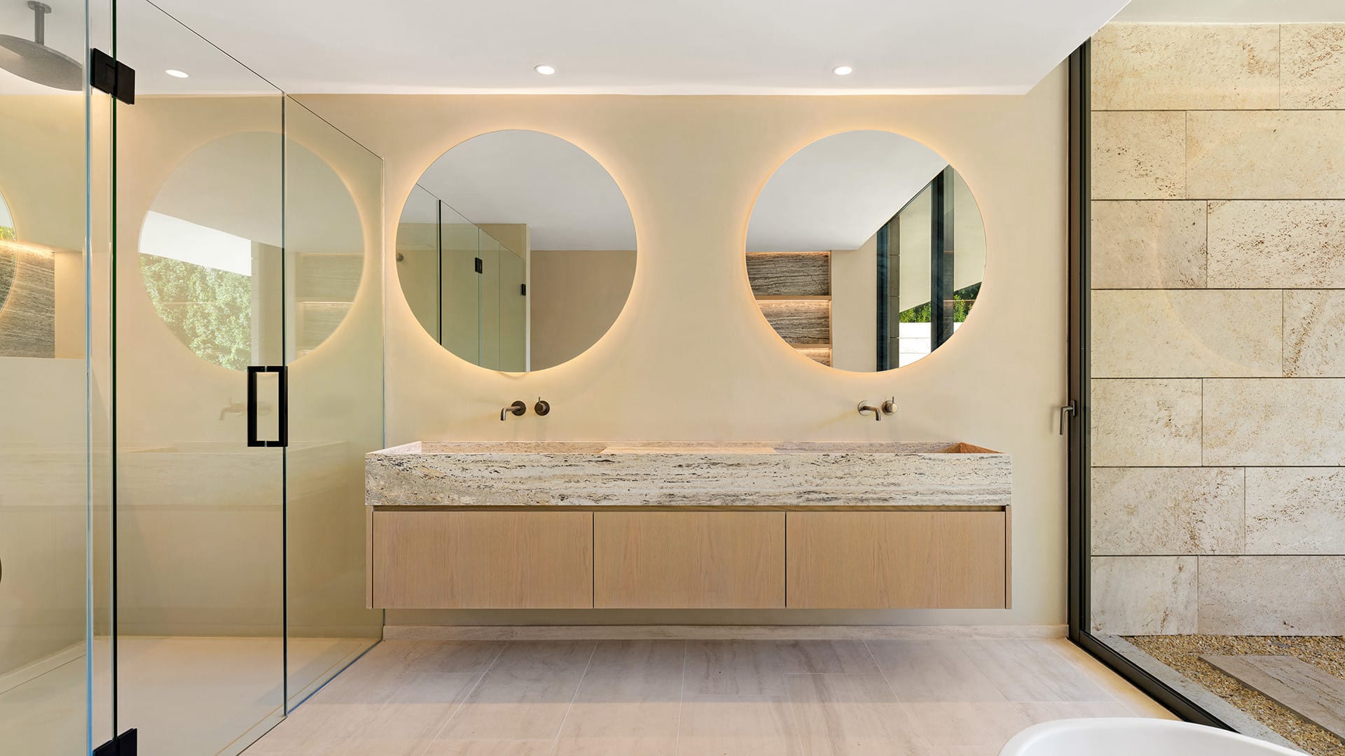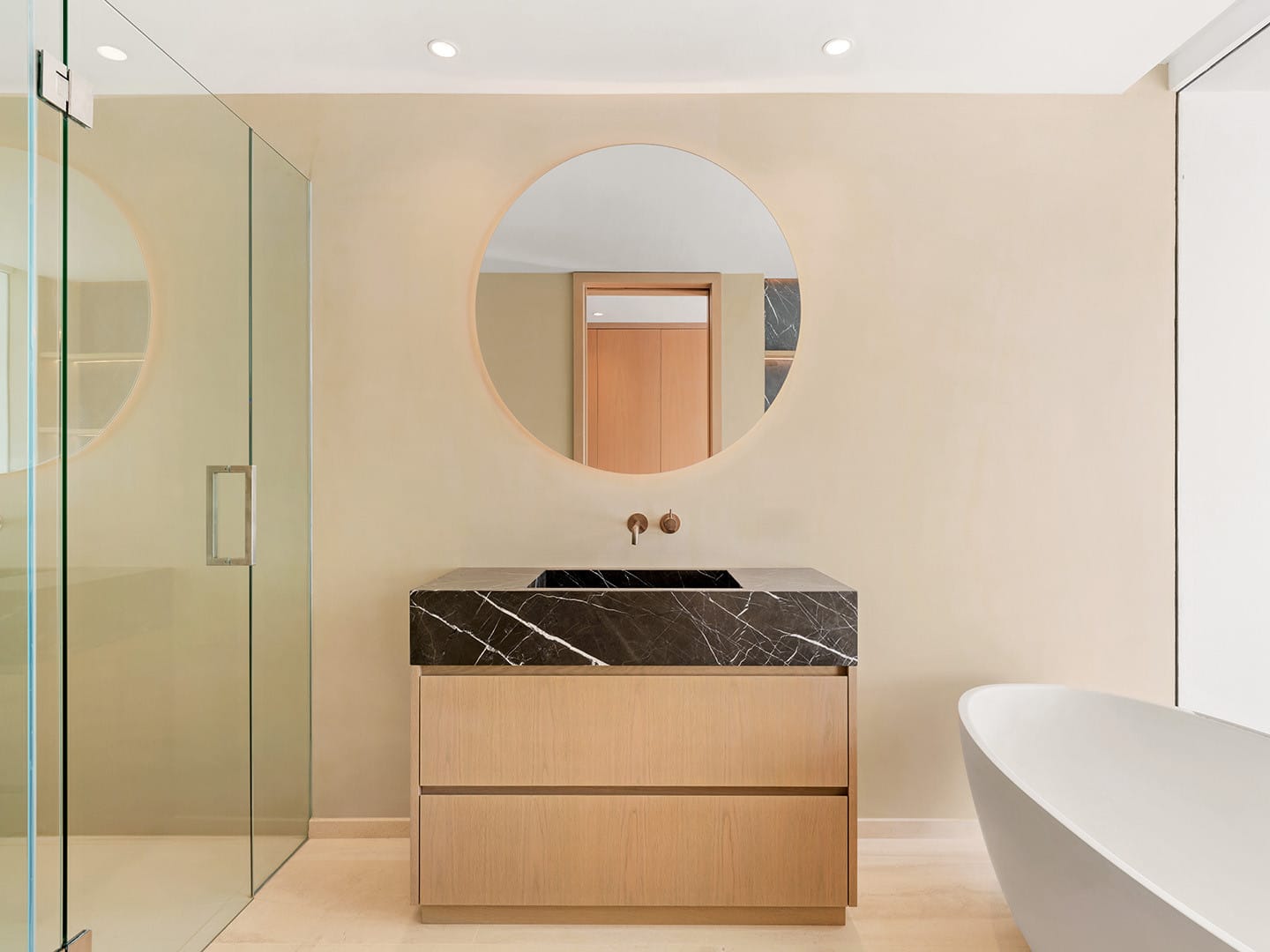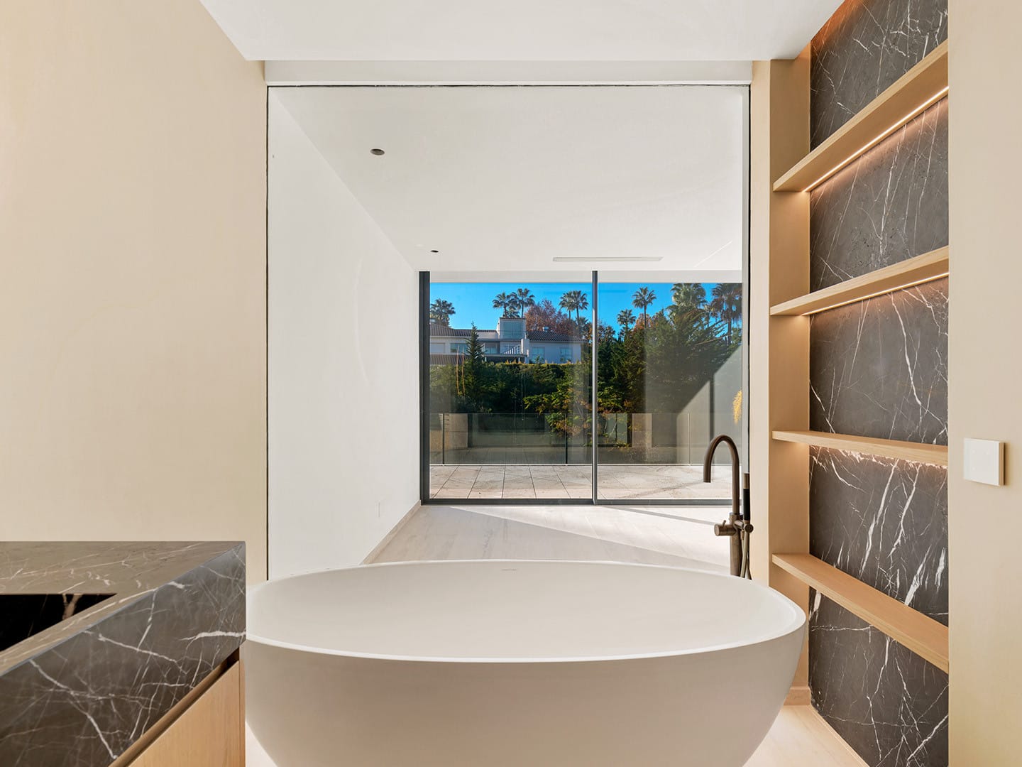 En la planta inferior, la suite principal se convierte en un santuario íntimo con vestidor, baño en suite y ducha exterior rodeada de vegetación. En este nivel, los espacios adicionales permiten diseñar un spa privado, gimnasio, cine o bodega, adaptándose a las necesidades y estilo de vida de quienes lo habiten.